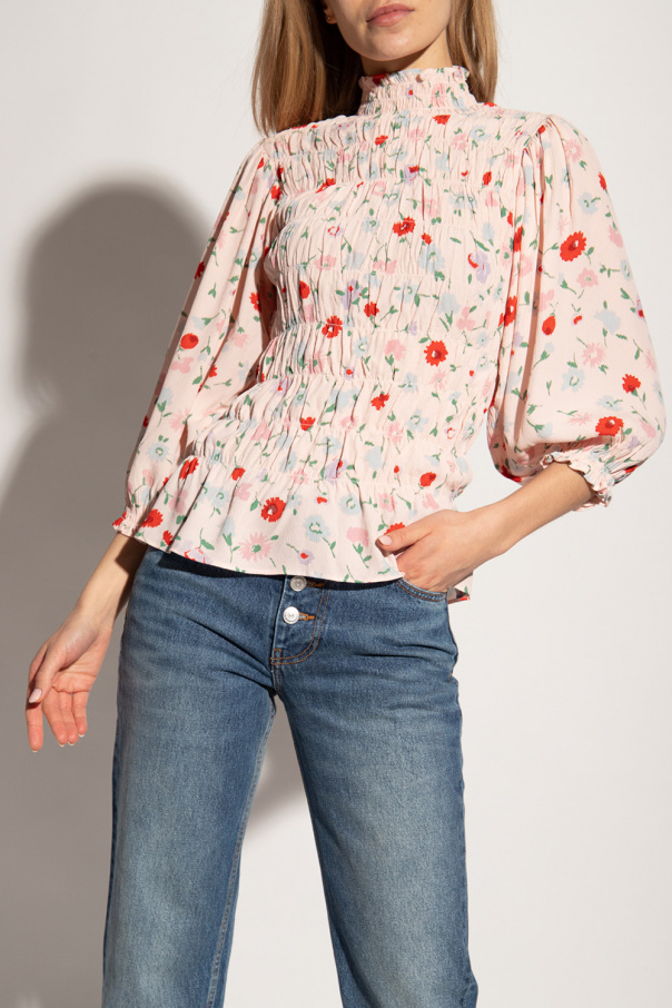 Light pink top with a mock neck from Samsoe Samsoe. This garment features gathers, a multicolored floral pattern and long sleeves with elasticated cuffs.