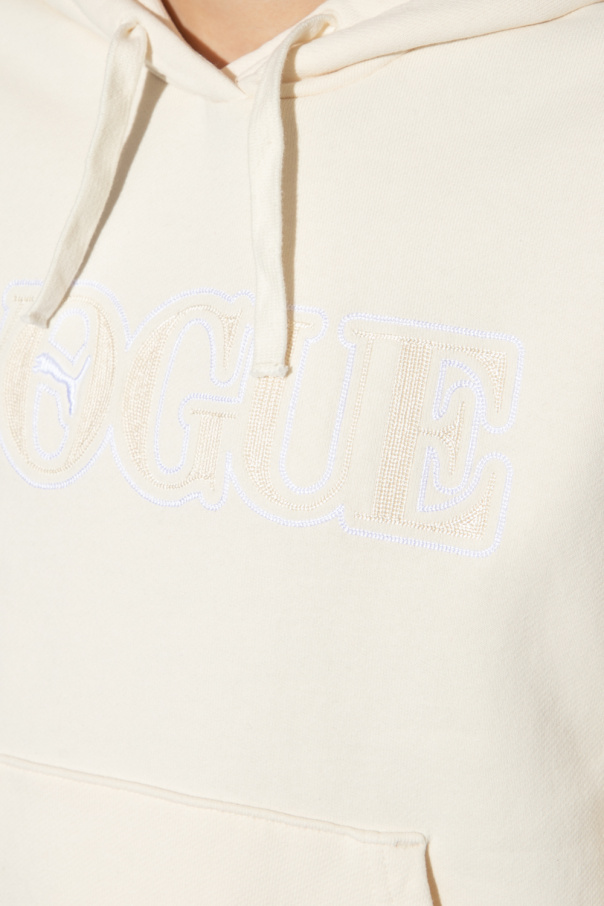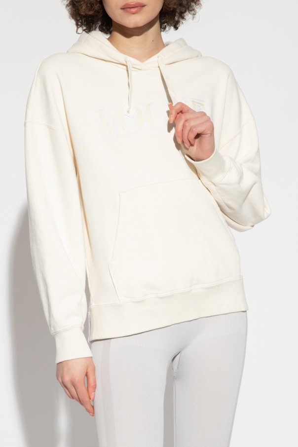 Cream hoodie from PUMA x VOGUE. Made with at least 20% recycled material, this garment features a white and cream logo embroidery, drawstring hood, slip pocket and ribbed trims at the hem and cuffs.