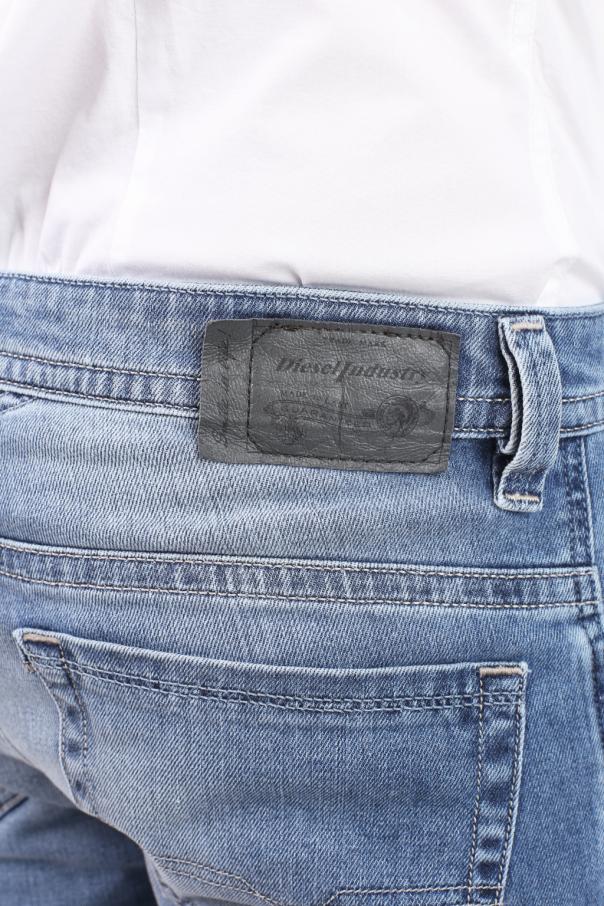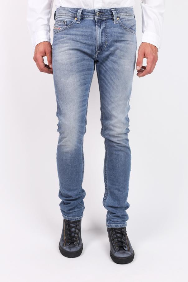 Blue distressed \'Thavar\' slim-fit jeans from Diesel. Low waist. Zip fastening.