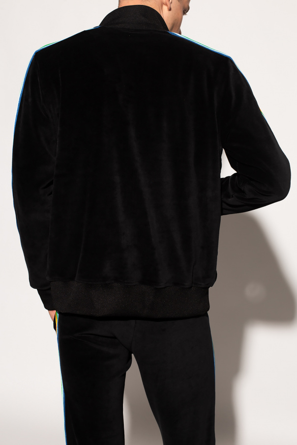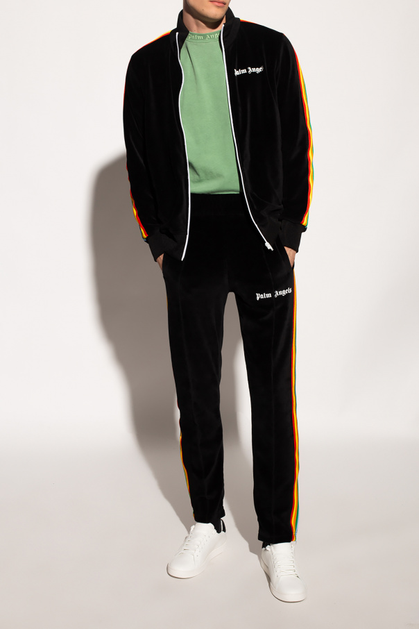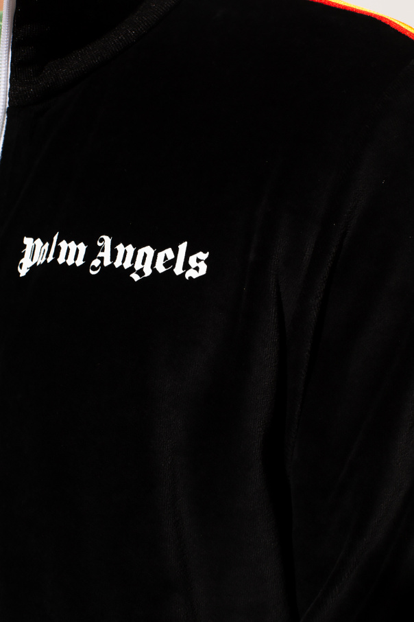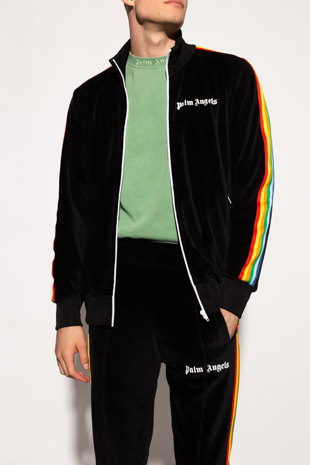 Black sweatshirt with a mock neck from Palm Angels. Crafted from velvet trims, this design features a white zip, logo print, multicolored stripes down the sleeves and ribbed trims at the neck, hem and cuffs.