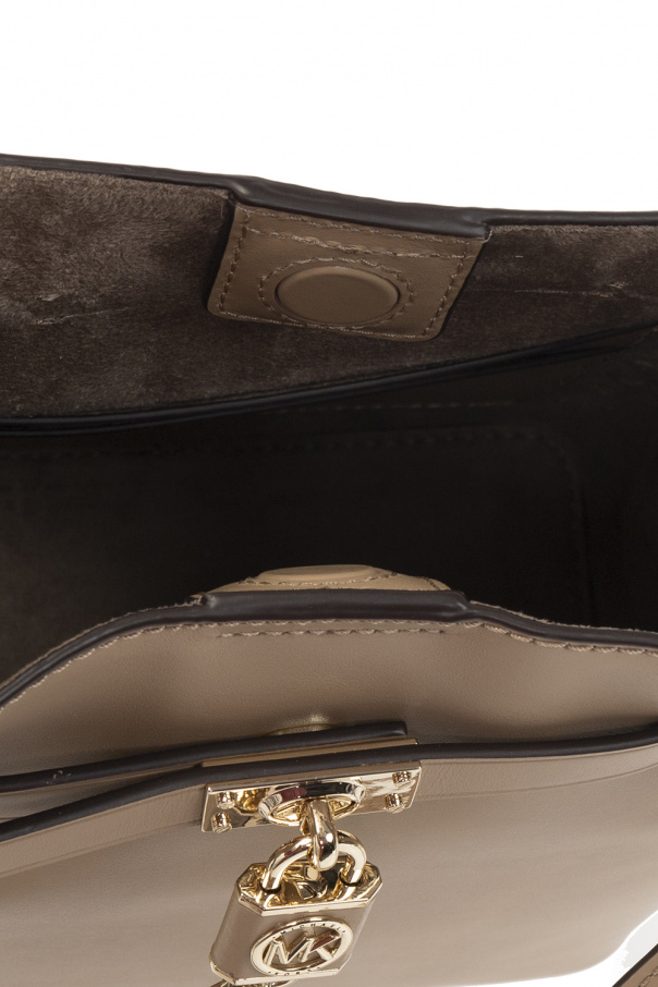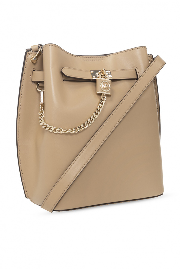 Beige ‘Hamilton Legacy Medium’ shoulder bag from Michael Michael Kors. Crafted from bovine leather, this model features a magnetic snap, decorative padlock closure with a chain and logo, adjustable shoulder strap, gold-tone metal hardware and one internal compartment with two slip pockets.