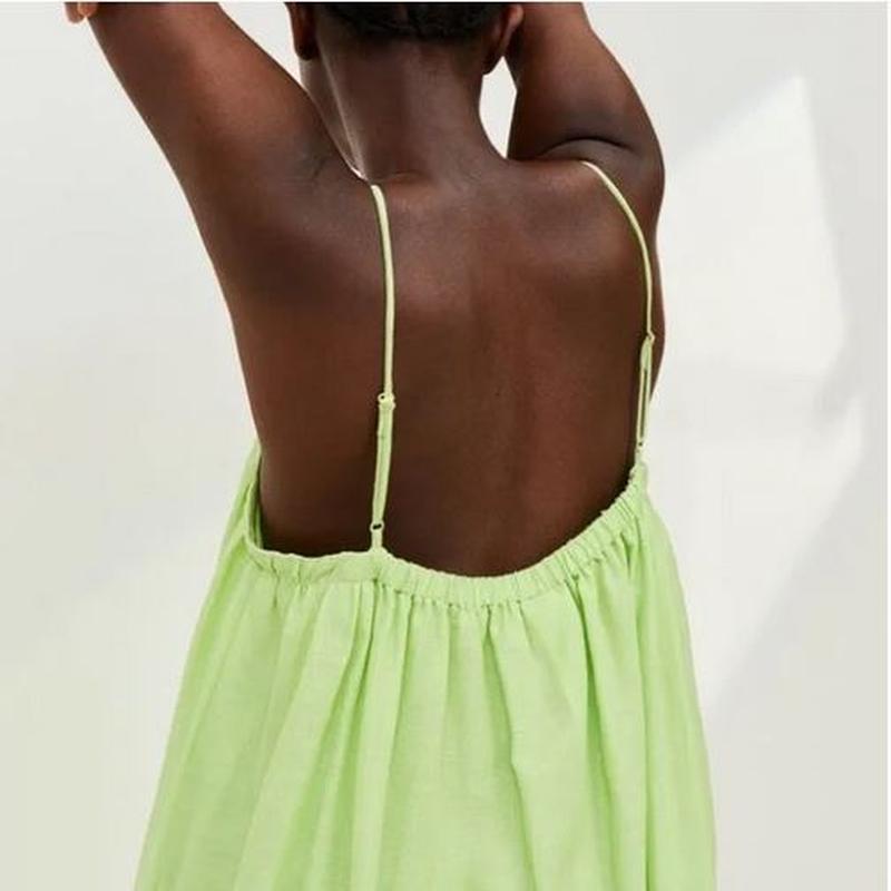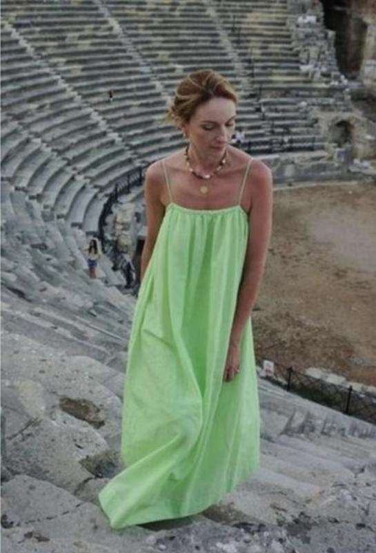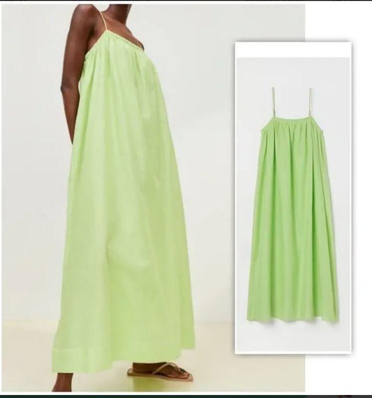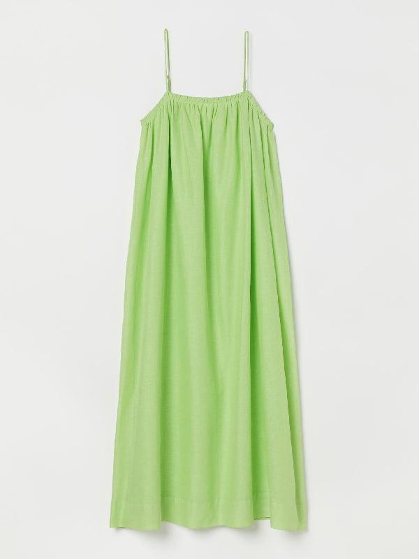 Плаття з тканини трапеції з ніжної суміші льону та бавовни, що створює об'ємний силует. Довжина до середини литки. Вузькі регульовані бретелі. З підкладкою.