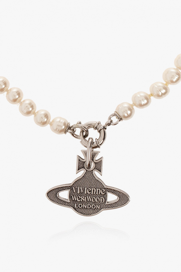 Cream and silver-tone ‘Hilaro’ necklace from Vivienne Westwood. Crafted from brass and glass pearls, this item features a lobster clasp closure and decorative logo charm.