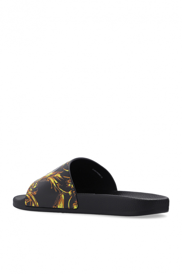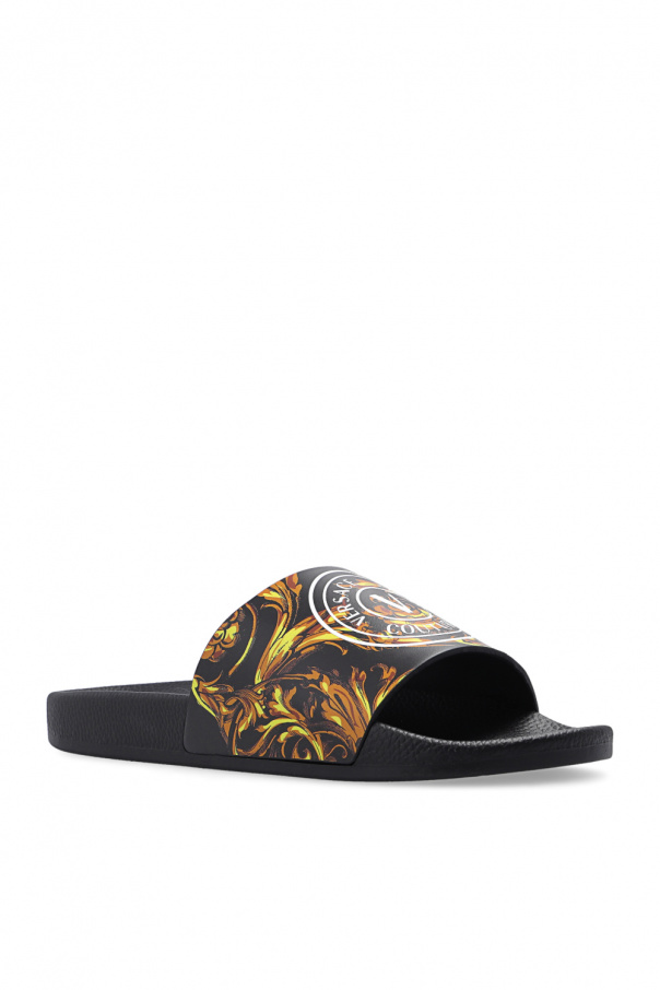 Black ‘Shelly’ slides from Versace Jeans Couture. Sitting on a black rubber sole, this model showcases white logo detailing and the brand's signature pattern in yellow and brown.