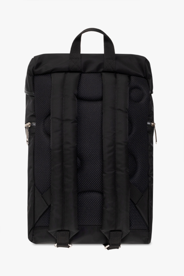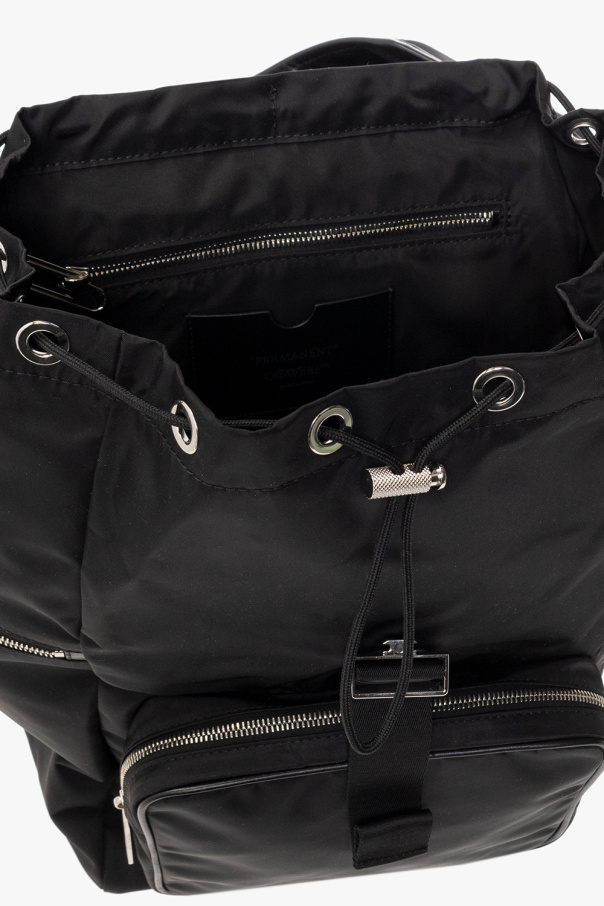 Black backpack from Off-White. This design features a flap with a strap and metal snap button with the brand\'s signature arrows, white logo print, three zip pockets, half-round handle, adjustable shoulder straps, silver-tone metal hardware and one internal compartment with drawstrings, one zip pocket and one card slot.