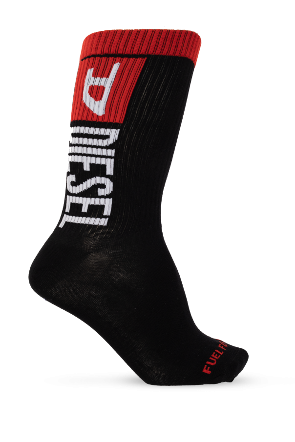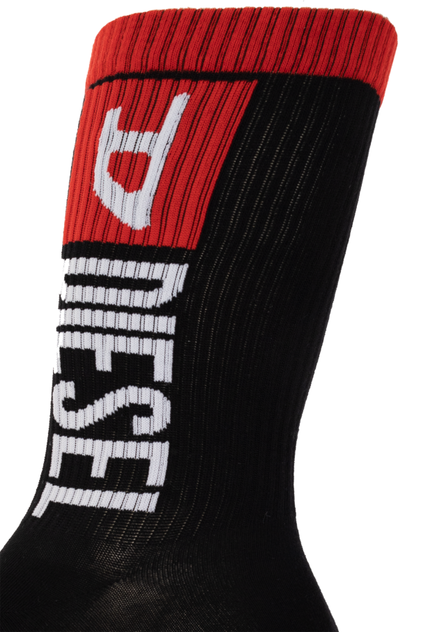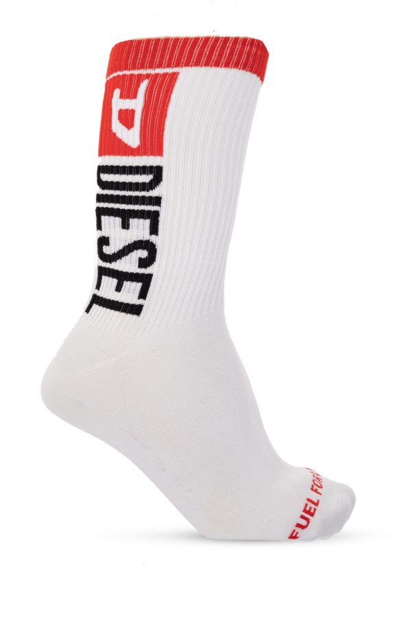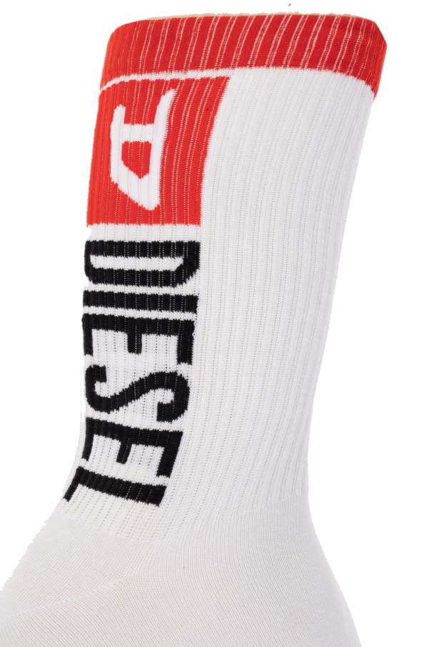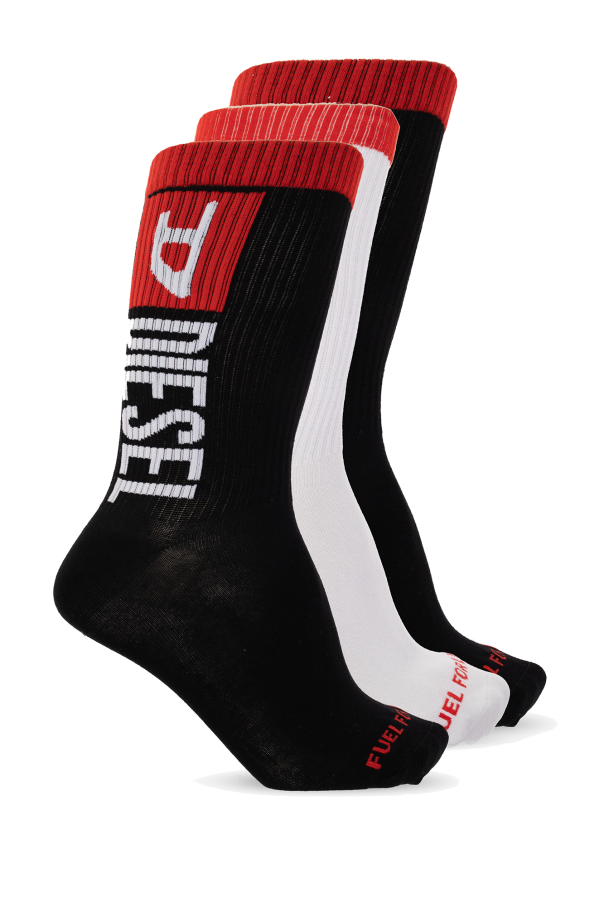 Black and white ‘SKM-RAY’ socks three-pack from Diesel featuring a red logo and ribbed cuffs.