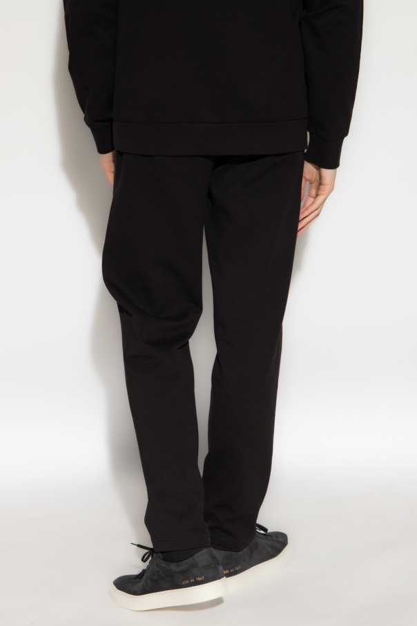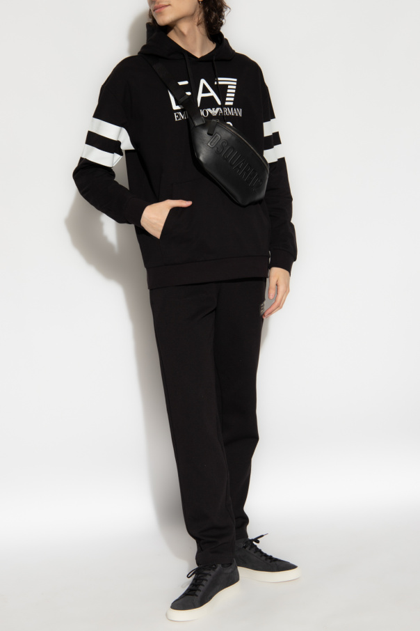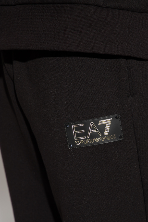 Black sweatpants from EA7 Emporio Armani. Crafted from a cotton blend, this pair falls with tapered legs and features a drawstring waistband, two zip pockets and a black and gold-tone logo patch on the front.