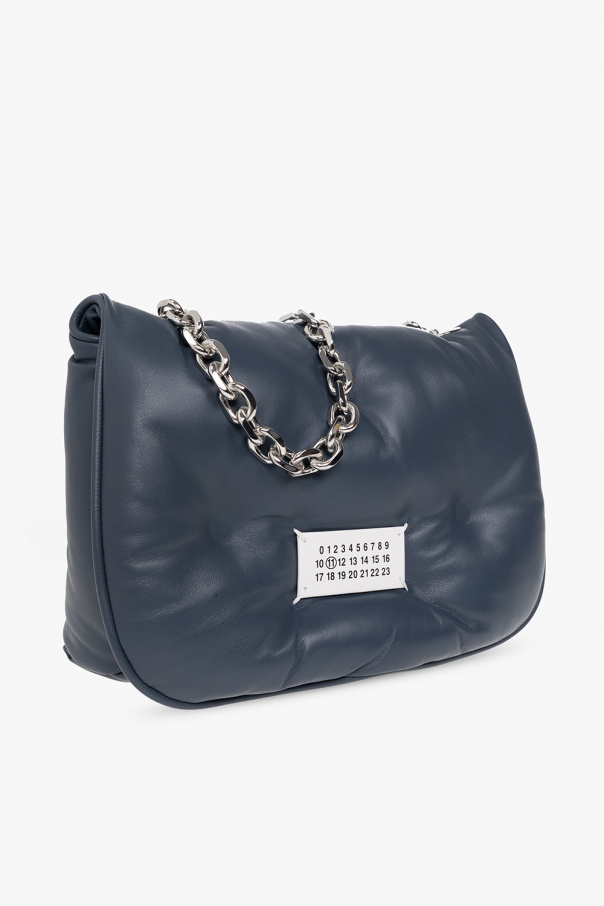Bluish grey ‘Glam Slam’ quilted shoulder bag from Maison Margiela. Made of lamb leather, this model is complete with magnetic snaps, white patch with a numeric logo, shoulder chain, silver-tone metal hardware and one internal compartment with one slip pocket.