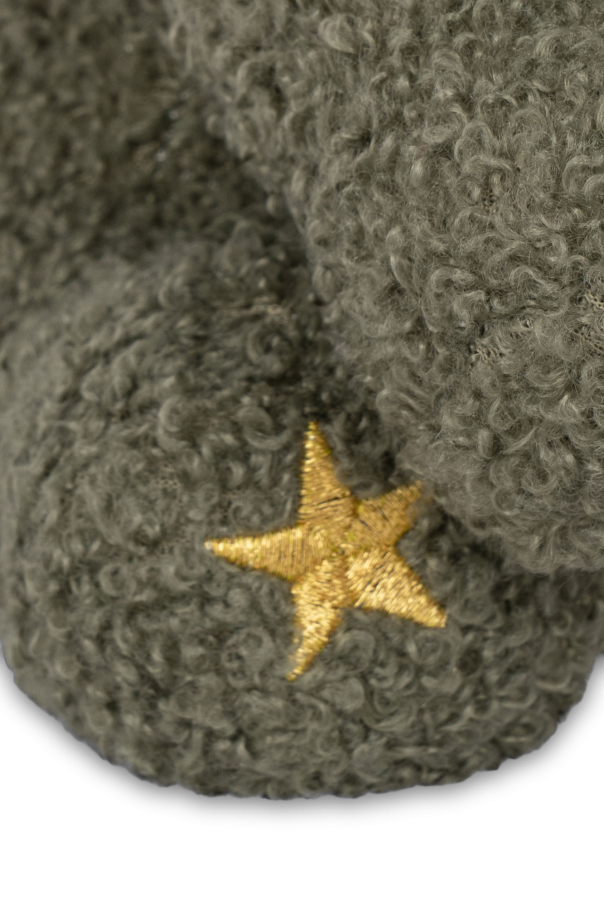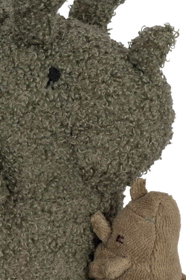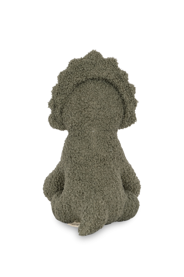 Dark green ‘Teddy’ triceratops musical activity toy from Konges Slojd. Made from fabric, this item comes with a baby dino doll and showcases gold-tone star embroidery.