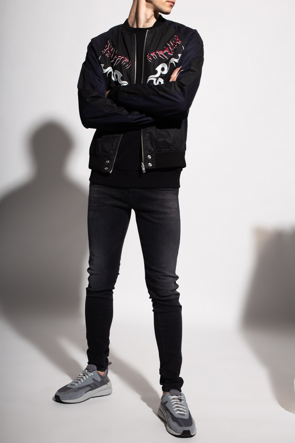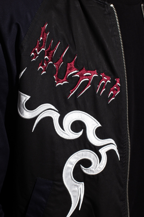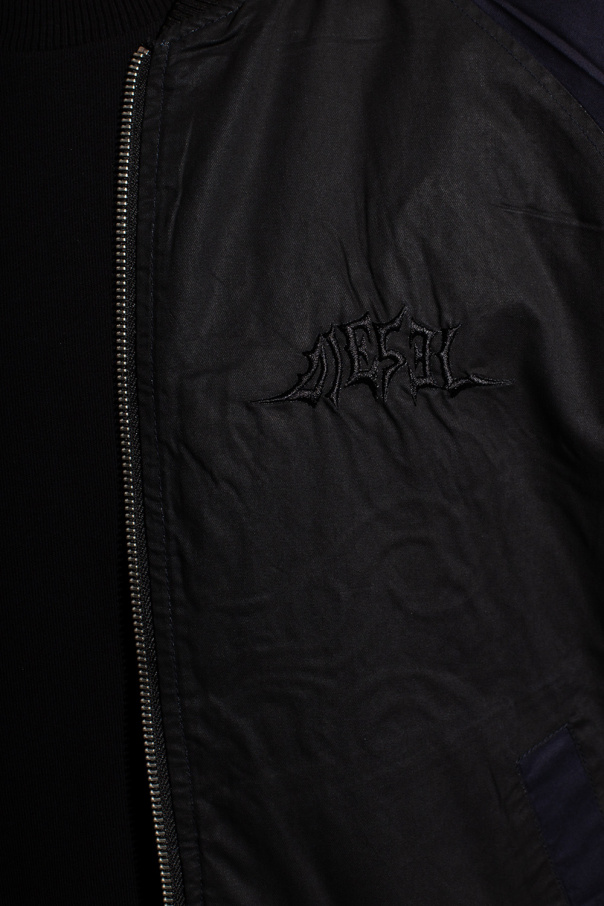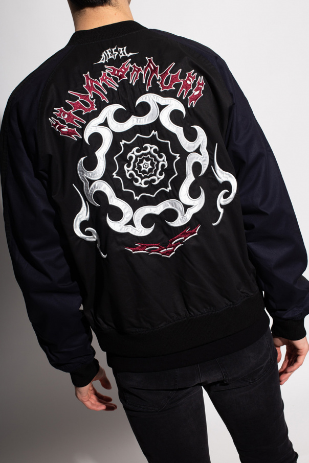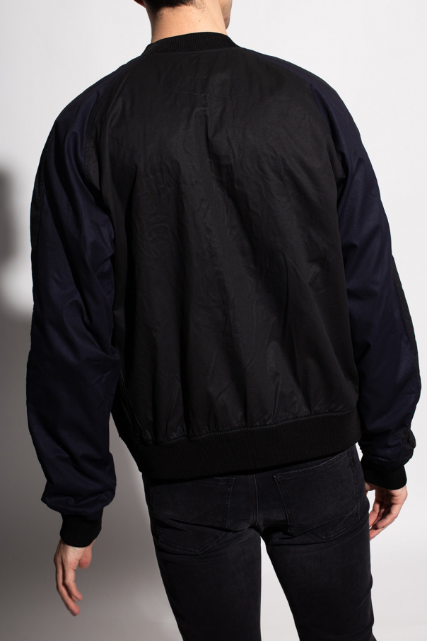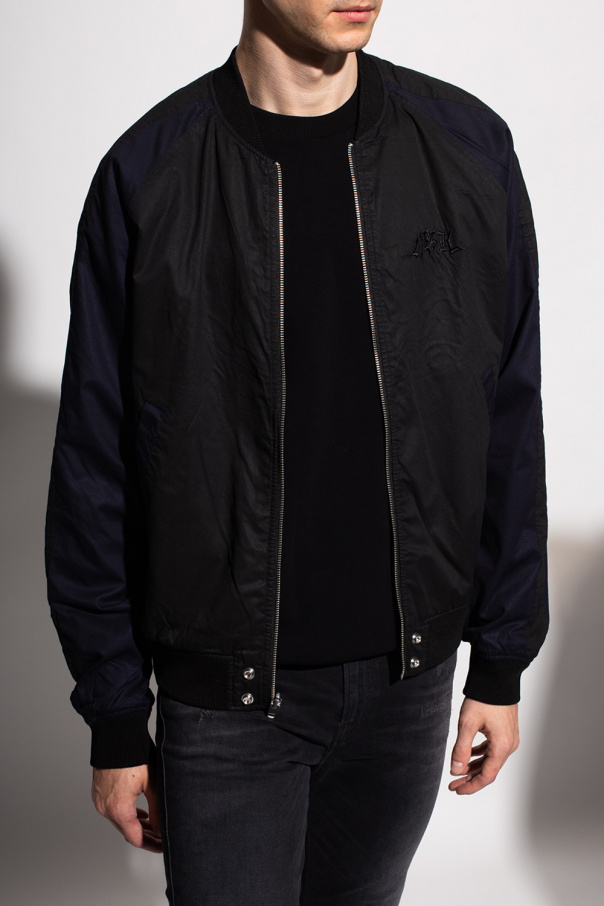 Black and navy blue bomber jacket from Diesel. Emblazoned with white, maroon and black logo patches, this style features a zip fastening, two slip pockets and a ribbed bottom hem and cuffs.