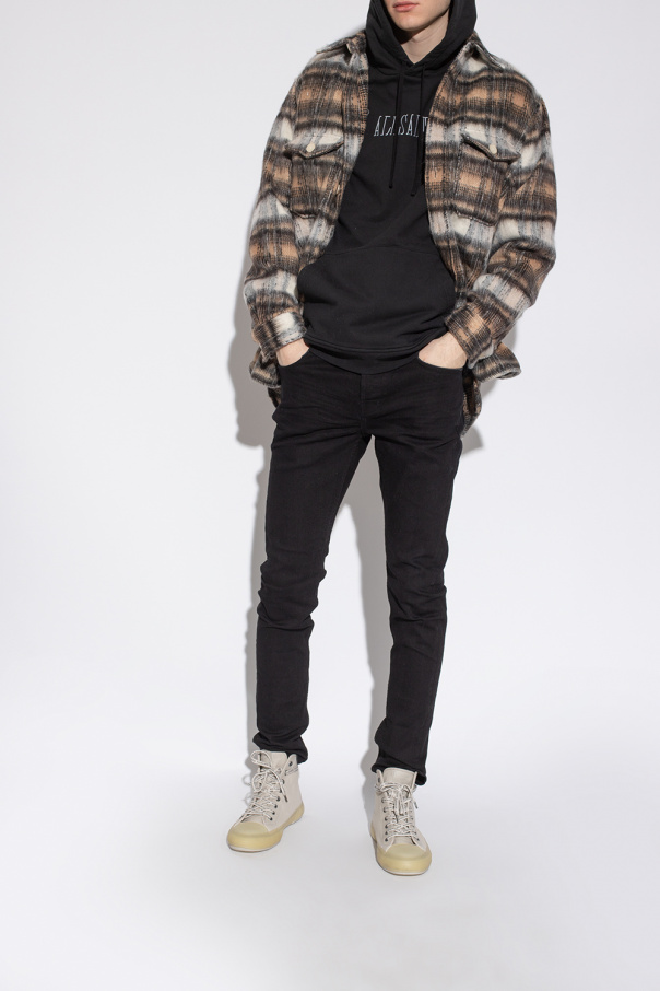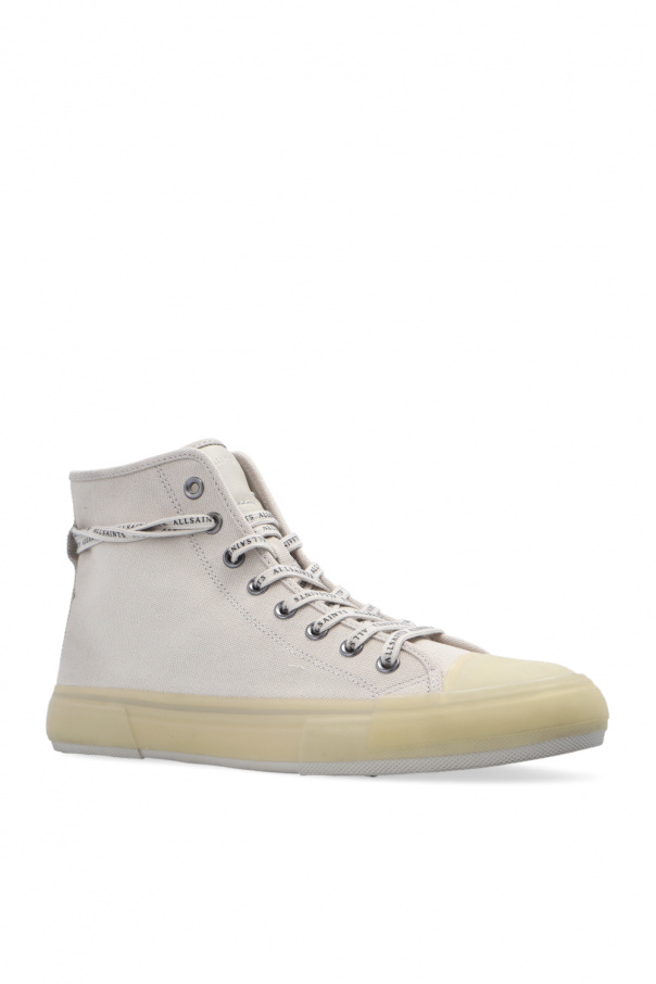 Greyish beige ‘Jaxon’ high-top sneakers from AllSaints. Crafted from fabric with white and transparent rubber trims, logo-embossed leather tongue patch and rubber sole in grey and beige.