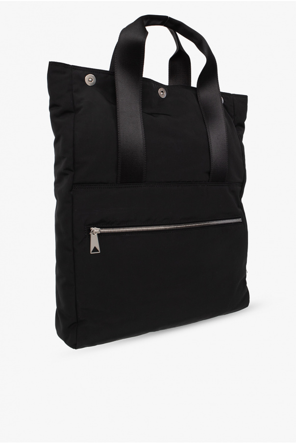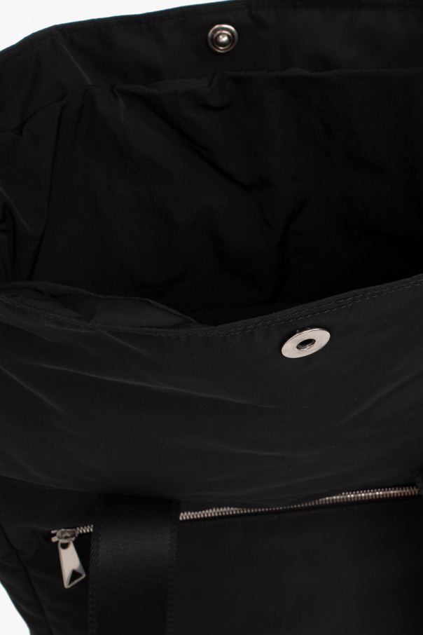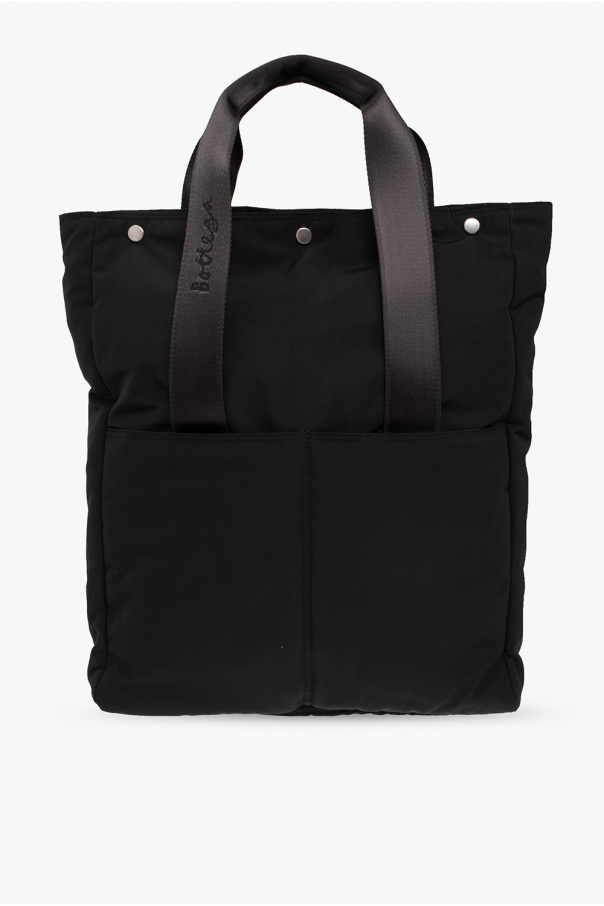 Black ‘Snap Medium’ shopper bag from Bottega Veneta. Crafted from technical material, this design secures with snaps and features two velcro pockets on one side, one zip pocket on the other side, two half-round handles embroidered with a logo, silver-tone metal hardware and a zipper compartment and two slip pockets inside.
