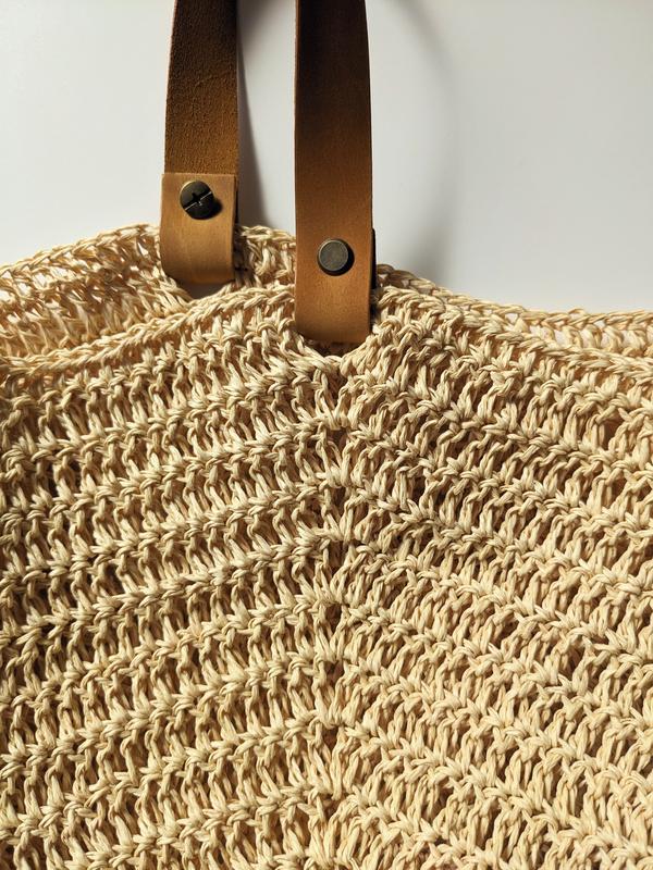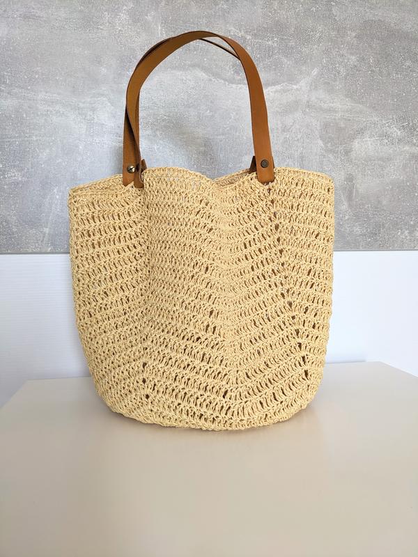 Розміри: висота 40 см, ширина 37 см, довжина ручок 40 см.Сумка сплетена із целюлозної рафії, ручки натуральна шкіра.