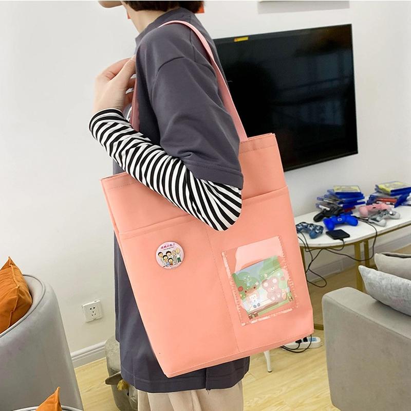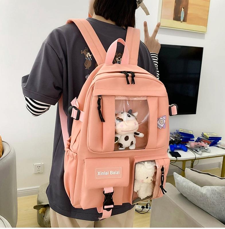 С лицевой стороны рюкзак декорирован прозрачными карманами, они функциональные и вместительные. Смотрится очень симпатично, по-девичьи. В прозрачный кармашек можно положить игрушку-талисман и прикрепить значки по своему усмотрению, они съемные - можно менять дизайн и расположение в зависимости от настроения.