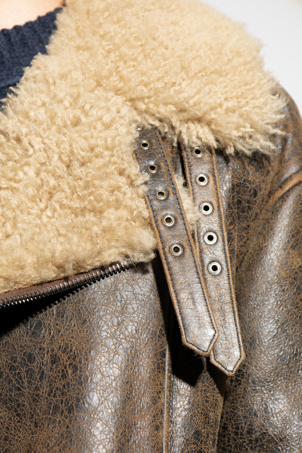Brown and beige jacket from Acne Studios. Made from lamb leather, this style fastens with a zip and showcases a shearling collar with buckle tabs. It is complete with two snap-fastened pockets, two slip pockets, logo detailing and long sleeves with shearling cuffs.