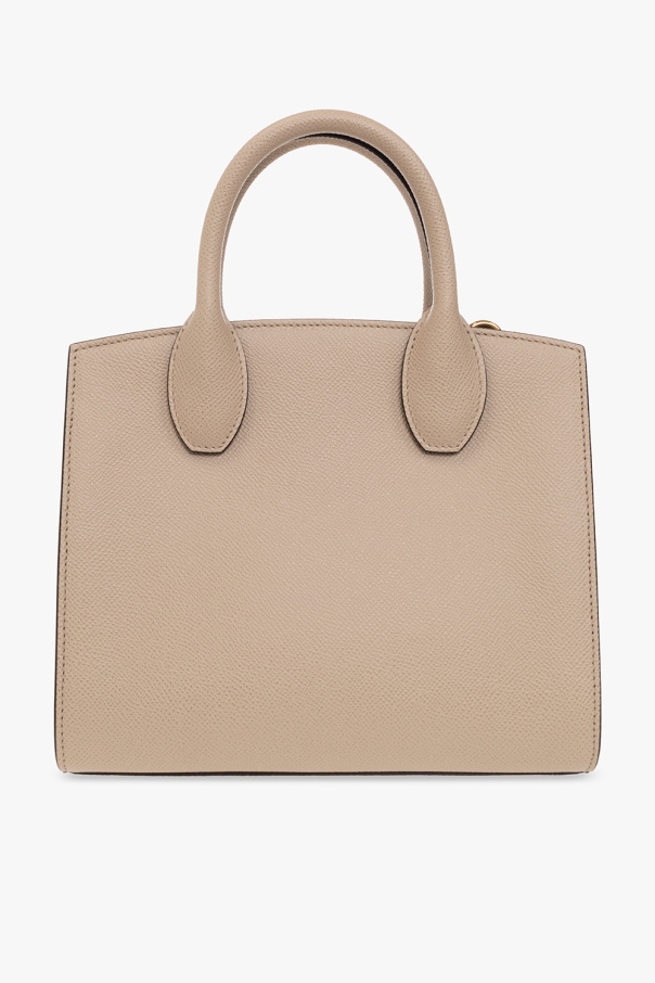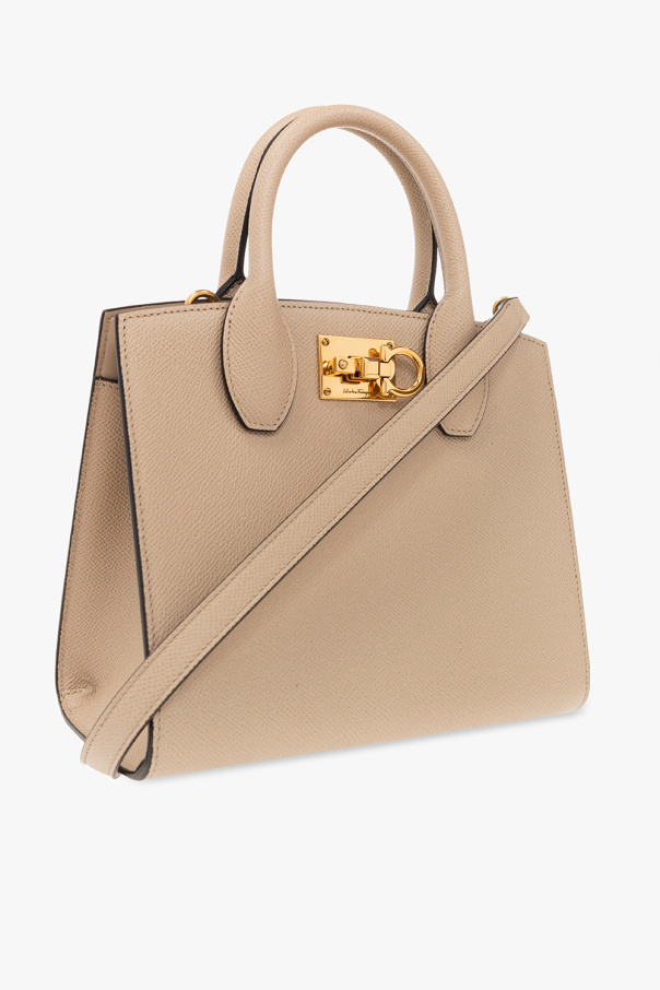Beige ‘Studio Box Mini’ shoulder bag from FERRAGAMO. Crafted from calf leather, this design features a distinctive Gancini fastener, two half-round handles, a detachable and adjustable shoulder strap, gold-tone metal hardware and one internal compartment two card slots.