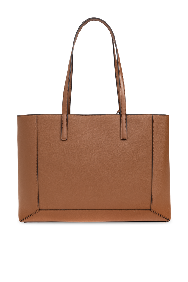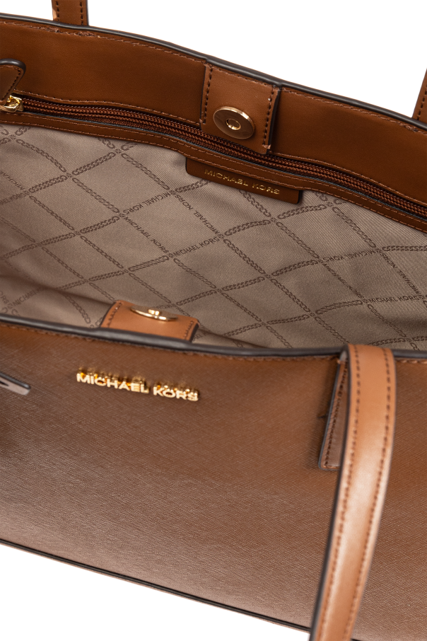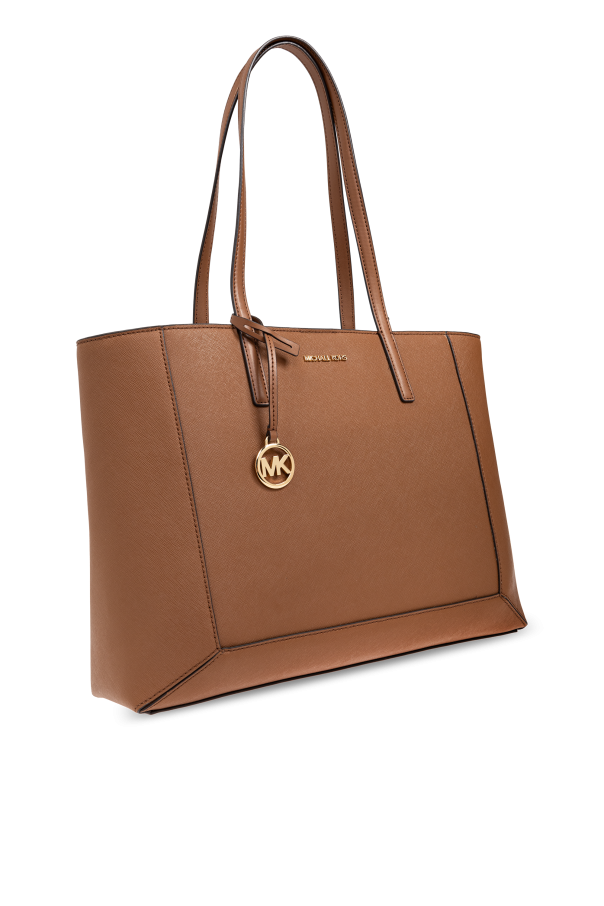 Introducing the exclusive Sallie Shopper Bag from the esteemed designer Michael Kors. This exquisite bag, crafted with precision and elegance, epitomizes the perfect blend of style and functionality. Designed in a classic rectangular shape, the Sallie Shopper boasts a spacious and practical silhouette. Its minimalist yet sophisticated construction ensures versatility and timeless appeal. Made from premium saffiano leather, the bag is not only durable but also resistant to scratches, promising longevity and enduring beauty. The interior is lined with an elegant diamond-patterned fabric, adding a touch of luxury to every glance inside. The front of the bag features the iconic gold-toned Michael Kors logo, while an ornamental charm bearing the \"MK\" emblem hangs gracefully from one of the handles. The bag is secured with a magnetic closure and includes an internal zippered pocket for added security. Two long handles offer the convenience of carrying it over the shoulder, making it ideal for everyday use or as a chic accessory for more formal occasions. Why Choose This Product? Crafted from high-quality saffiano leather, ensuring durability and scratch resistance. Spacious interior, perfect for daily essentials and documents. Elegant design with gold-toned details and a sophisticated finish. Versatile brown color, easily matching various outfits. Functional features like a magnetic closure and internal zippered pocket.