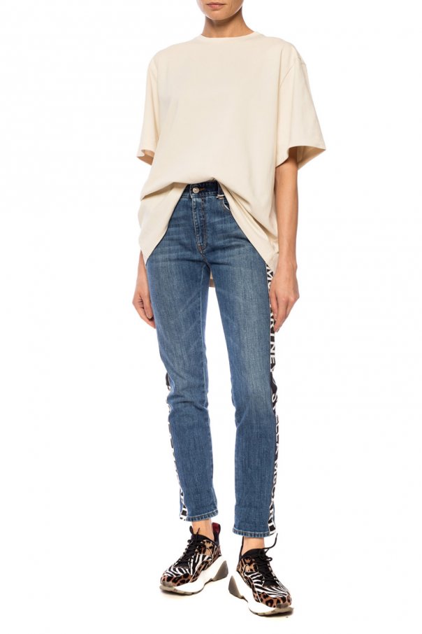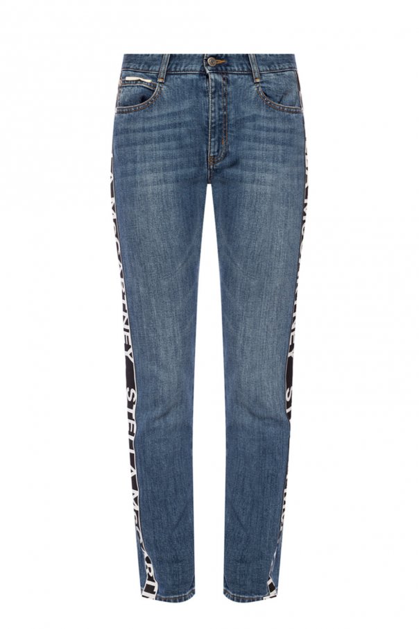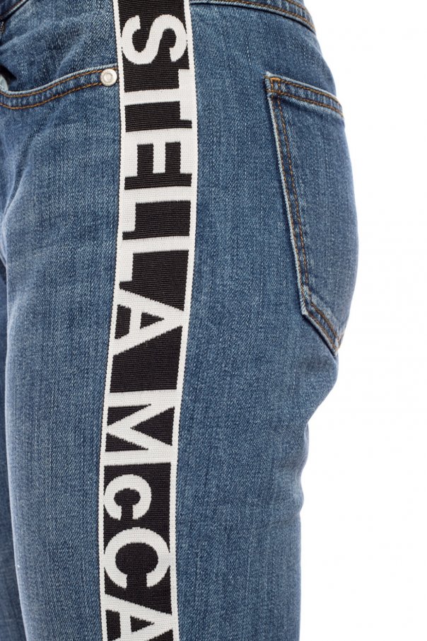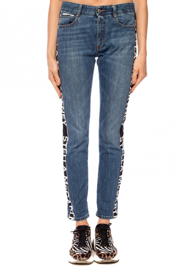 Blue jeans from Stella McCartney. Fastened with zip and button. Embellished with black and white branded panels along the sides. They feature 4 slip pockets and tapered legs with turned-up cuffs.