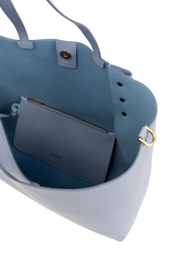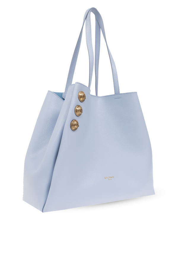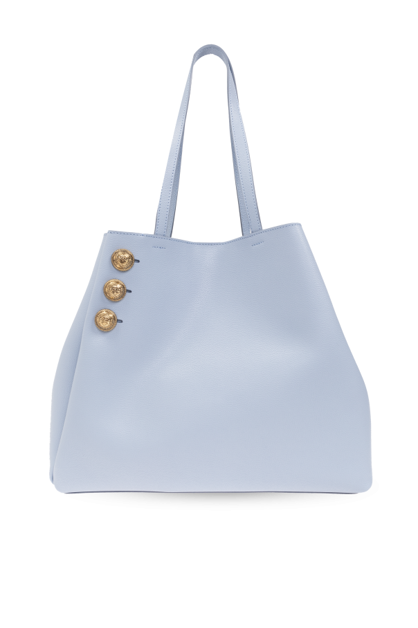 Discover the epitome of sophistication with the \'Embleme\' shopper bag by Balmain. Crafted from premium grainy calfskin leather, this light blue marvel exudes an air of refined elegance, perfect for the discerning fashionista. Its exterior is adorned with a series of gold-toned buttons on one side, each bearing the distinctive hallmark of the esteemed designer, while a subtle, gilded inscription of the designer\'s name adds a touch of luxury. The \'Embleme\' bag\'s interior is surprisingly spacious, featuring a detachable darker blue pouch or case, ideal for securing small essentials. This pouch, complete with a gold zipper and matching brand logo, effortlessly complements the bag\'s chic aesthetic. Additionally, a sleek, flat wallet or purse with a long strap is included, offering versatile styling options. This accessory, too, showcases gold designer details, including a logo and button, mirroring the bag\'s opulent design. Boasting a soft, relaxed structure, this shopper bag promises ample room for daily necessities, making it perfect for everyday use. Its minimalist yet elegant design, characteristic of luxury brands, is completed with a clasp and chain closure and metal accents in aged gold, ensuring both security and style. Why Purchase This Product? Made from 100% premium calfskin leather for durability and elegance. Incorporates unique gold-toned decorative buttons and details, enhancing its luxurious appeal. Features an ample and versatile interior with a detachable pouch and an additional wallet/purse for organized storage. Exemplifies a minimalist yet sophisticated design typical of the Balmain brand.