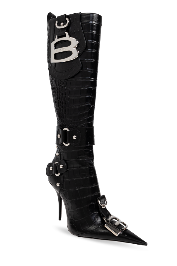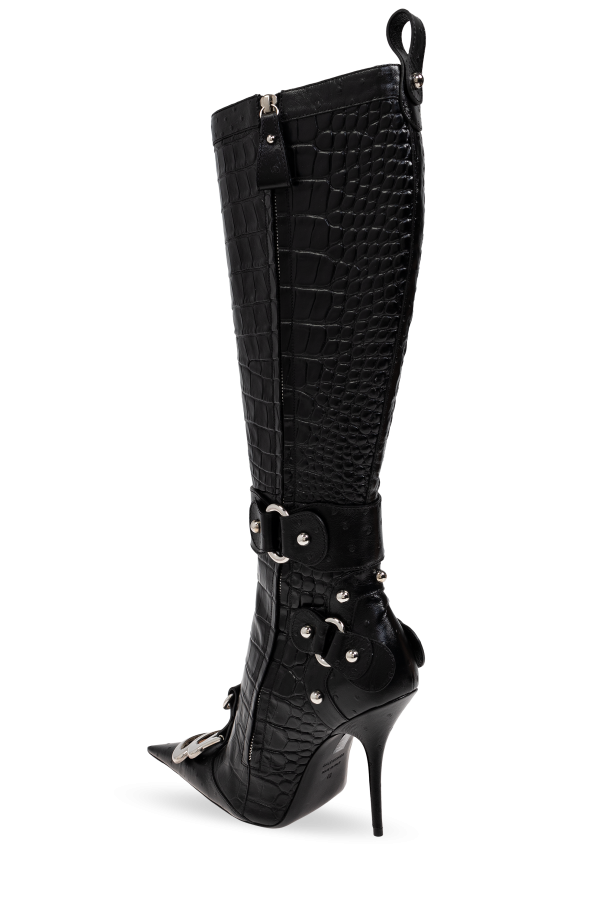 Introducing the exquisite Essex High Heel Boots from the renowned house of Balenciaga. These luxurious knee-length boots are a testament to the impeccable craftsmanship and visionary design that define this legendary brand. Crafted from black lambskin leather with a texture reminiscent of crocodile skin, these boots exude sophistication and elegance. The high stiletto heel and pointed toe create a sleek, elongated silhouette that is both timeless and daring. Distinctive features include elegant silver buckles adorning the straps at the ankle and top, complemented by a bold, metal \"B\" logo at the upper part, signifying the prestige of Balenciaga. The rear zipper closure ensures ease of wear, while additional metal accents and studs around the ankle add a touch of edginess and character. Why Buy This Product? Exquisite craftsmanship from a legendary designer. Luxurious black lambskin leather with a crocodile-like texture. Elegant and daring high stiletto heel and pointed toe. Distinctive silver buckles and bold Balenciaga \"B\" logo. Convenient rear zipper closure for easy wear. Perfect for special occasions and making a statement.