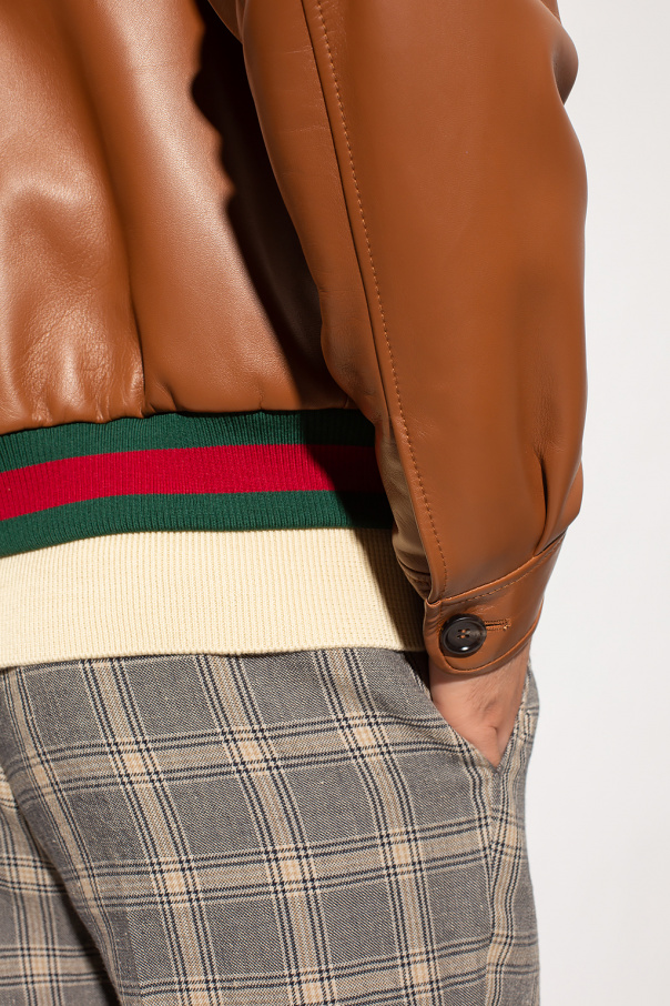 Brown jacket from Gucci. Crafted from lamb leather with a relaxed fit, this style secures with a zip and button and features two slip pockets, two flapped pockets, long sleeves with button cuffs and green and red Web rib-knit detailing at the bottom hem.