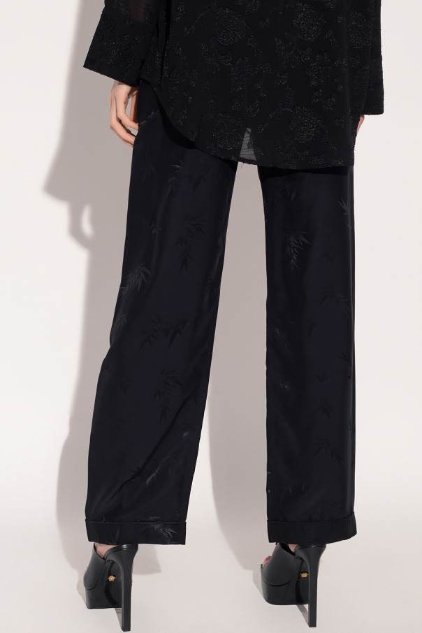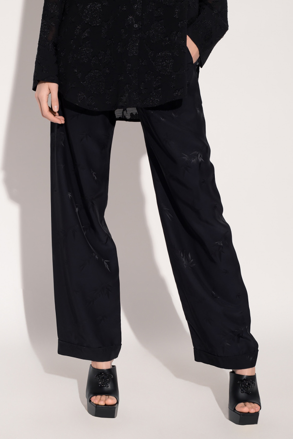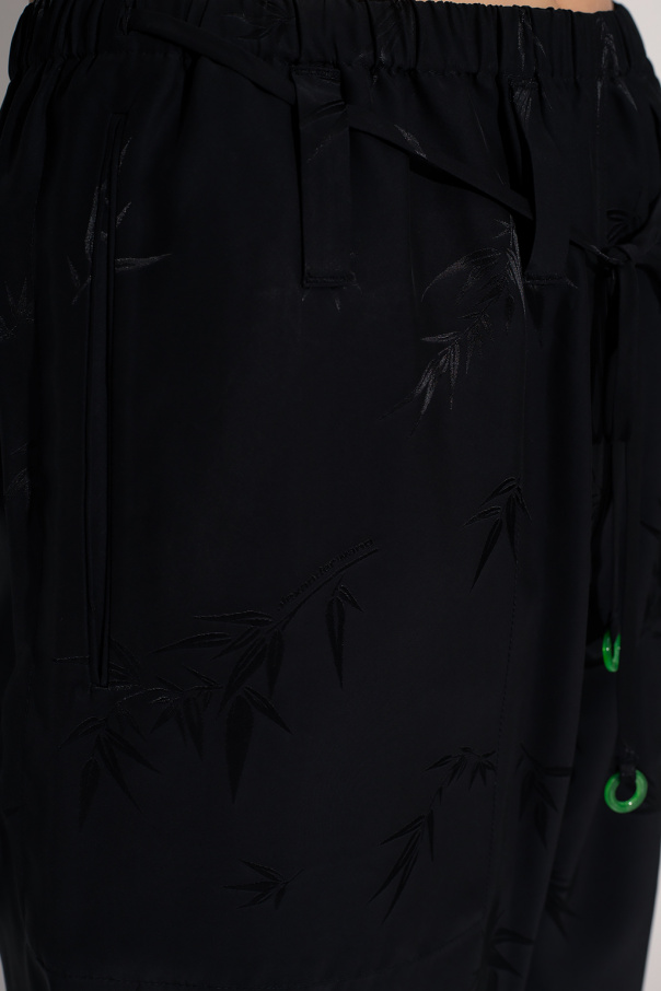 Black trousers from Alexander Wang. Embellished with a floral motif, this pair features a drawstring waistband, four slip pockets and slightly tapered legs with turn-up cuffs.