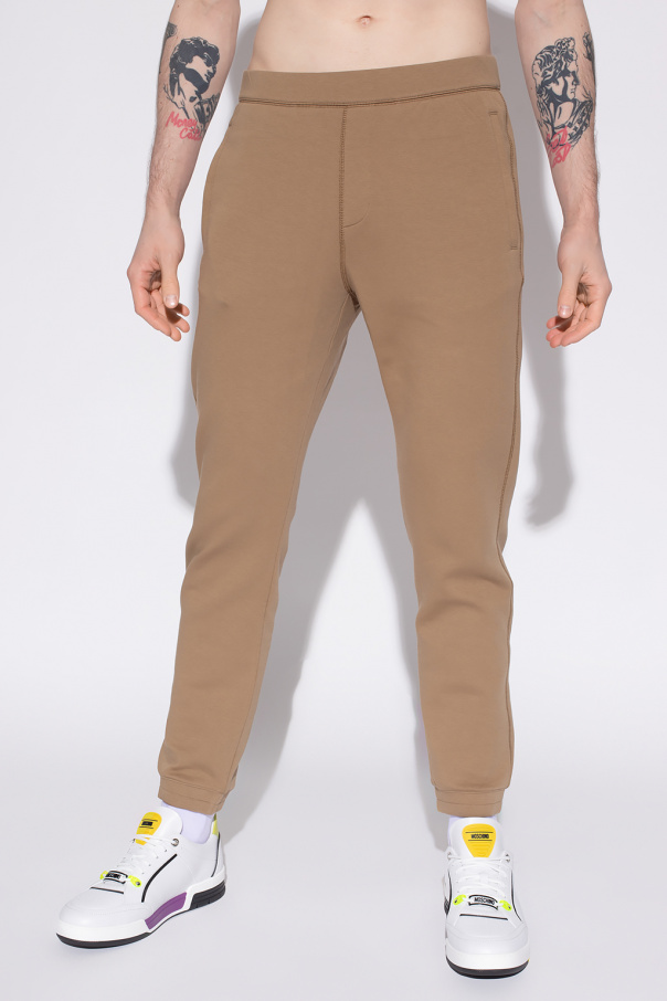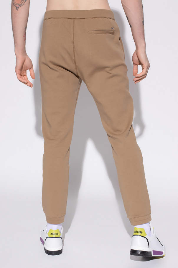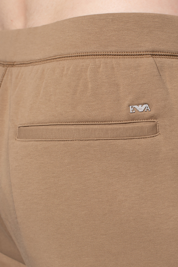 Beige sweatpants from Emporio Armani. Made of silk, this pair features a drawstring waist, two front pockets, one back pocket, silver-tone logo appliqué at the back and ribbed cuffs.