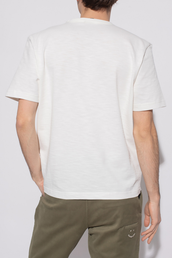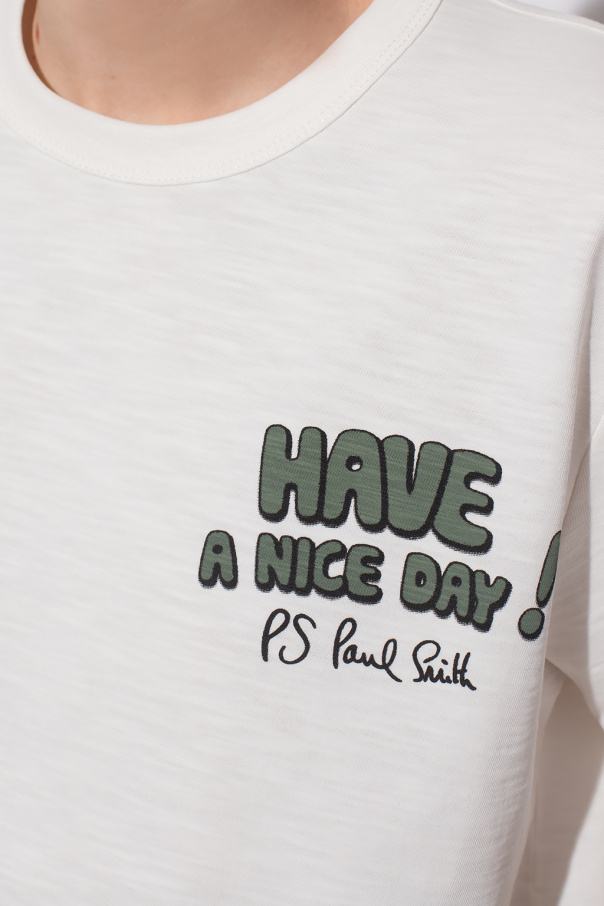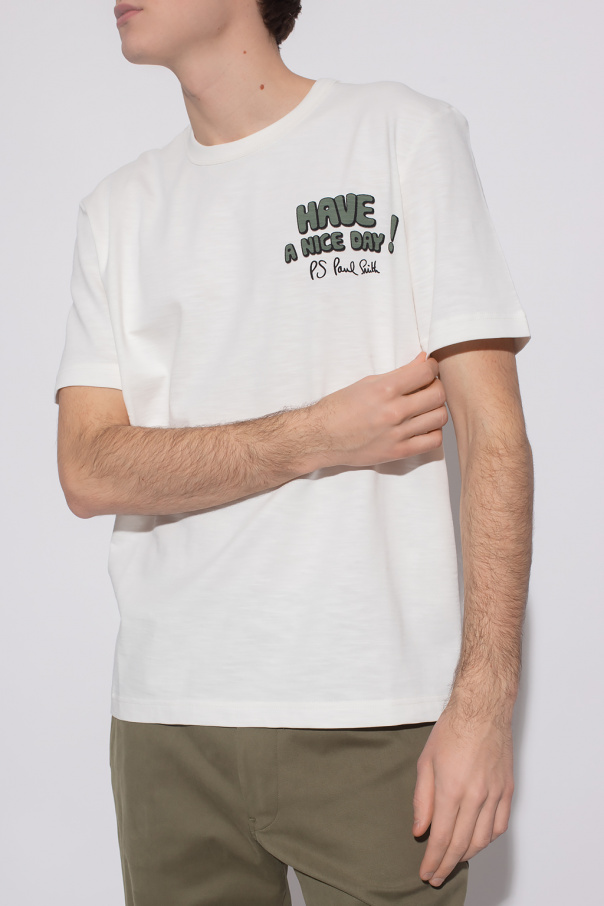 Cream crewneck T-shirt from Paul Smith. Crafted from organic cotton, this style features short sleeves, an elasticated collar and a khaki & black graphic print with the brand\'s logo on the front.