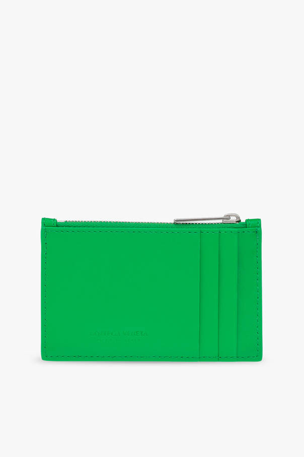 Green card case from Bottega Veneta. Crafted from a blend of lamb leather and calf leather, this item showcases the brand\'s iconic ‘Intreccio’ weave, three card slots, an additional compartment and an embossed logo at the back.