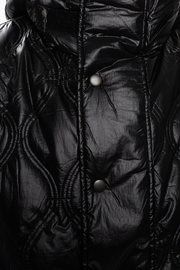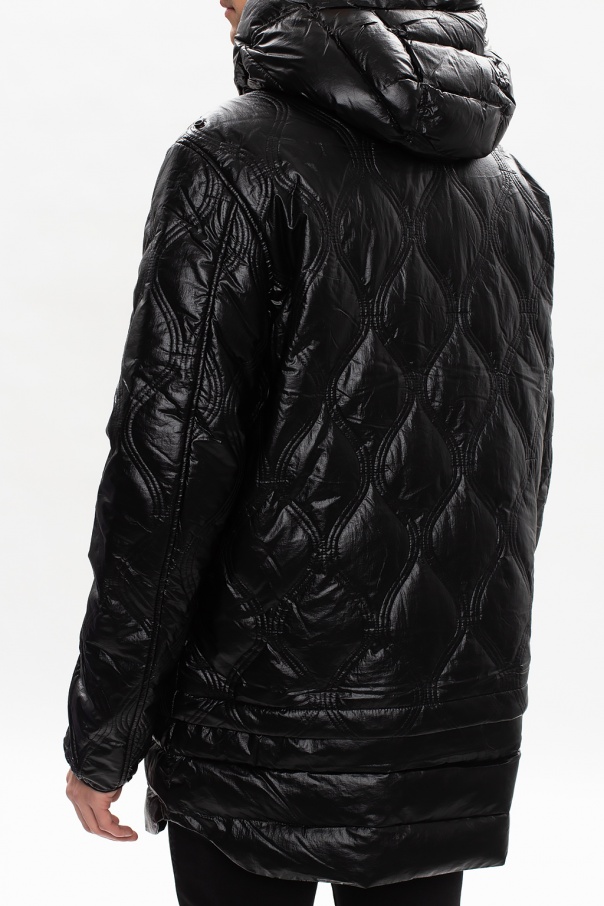 Black quilted jacket from Diesel. Designed in a lightweight, coated nylon with a detachable hem, this style fastens via a zip and snap-buttons and features a concealed front placket, two zipped pockets and a black and white branded velcro patch located on the hood.