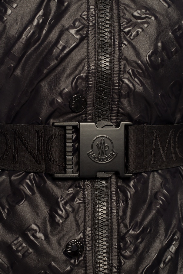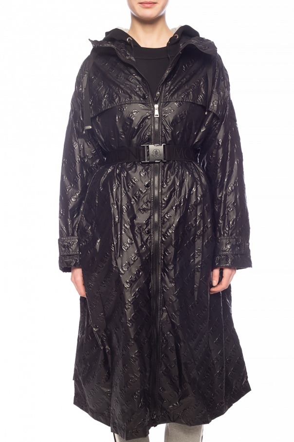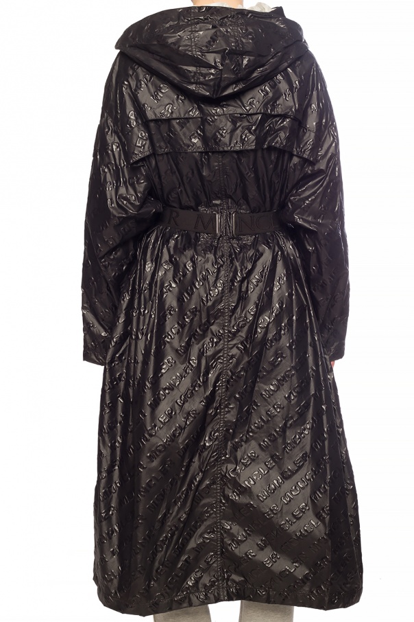 Black coat from Moncler. Zip fastening. Drawstring hood. Comes with a belt with a raised logo buckle. Made of textured fabric. Two slip pockets.
