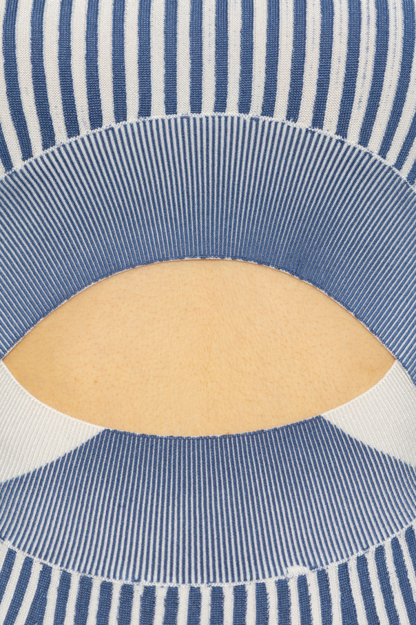 Blue and white sleeveless dress from Fendi. Crafted from ribbed stretchy silk with a pleat effect print, this design features a cut-out on the front and ribbed trims at the neck and cuffs.