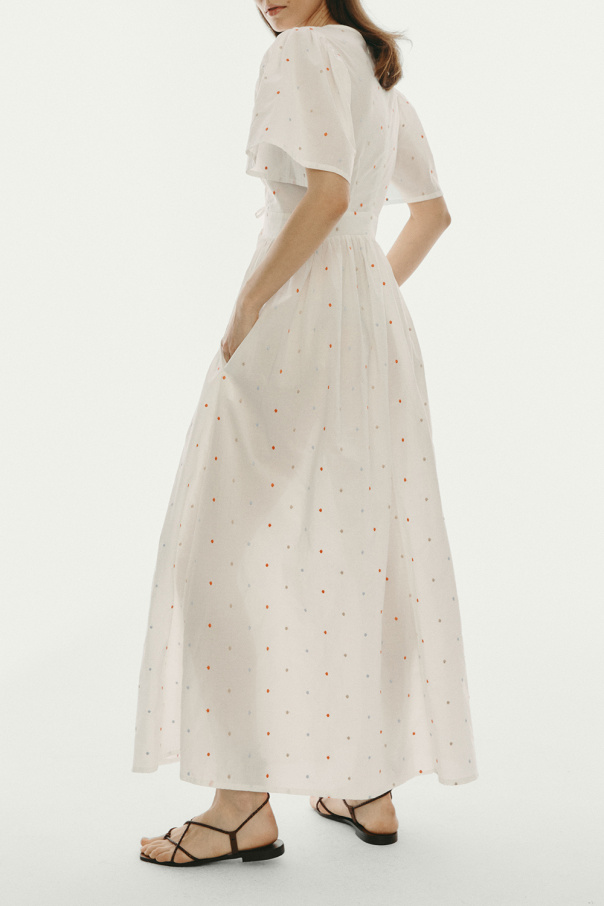 White ‘Talia’ dress from Le Petit Trou. Crafted from cotton, this style showcases colourful dots embroidery, an empire waist, a hidden back zipper, a V-neckline with a drawstring split, wide short sleeves and a flared maxi skirt with two slip pockets.