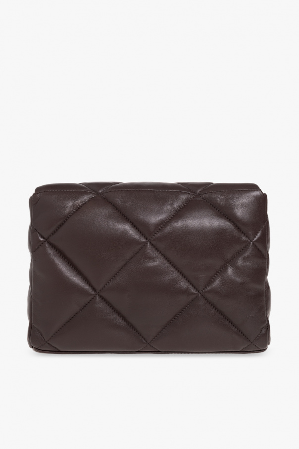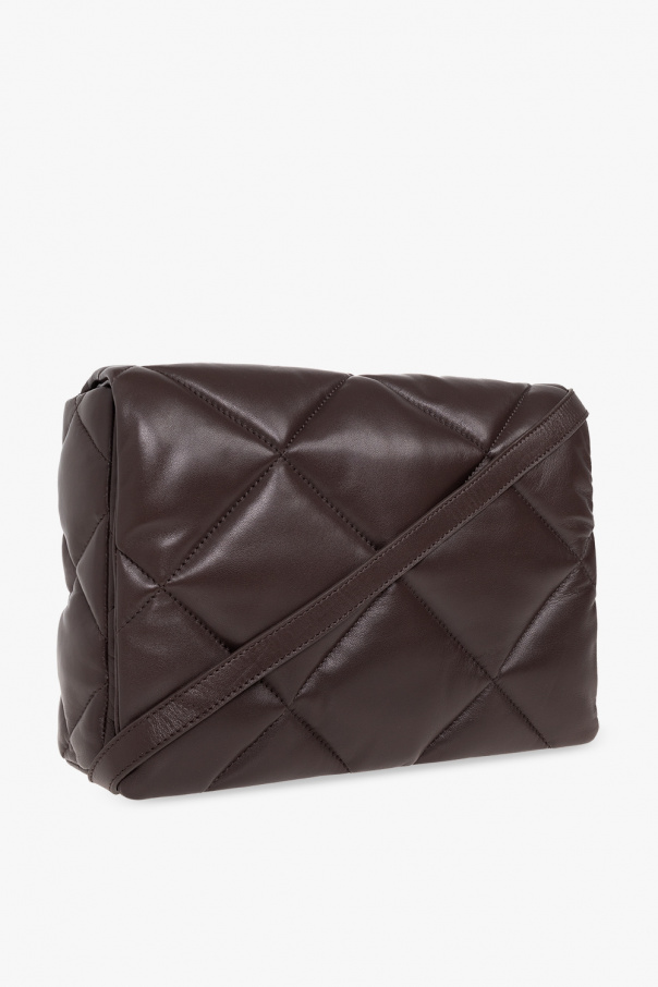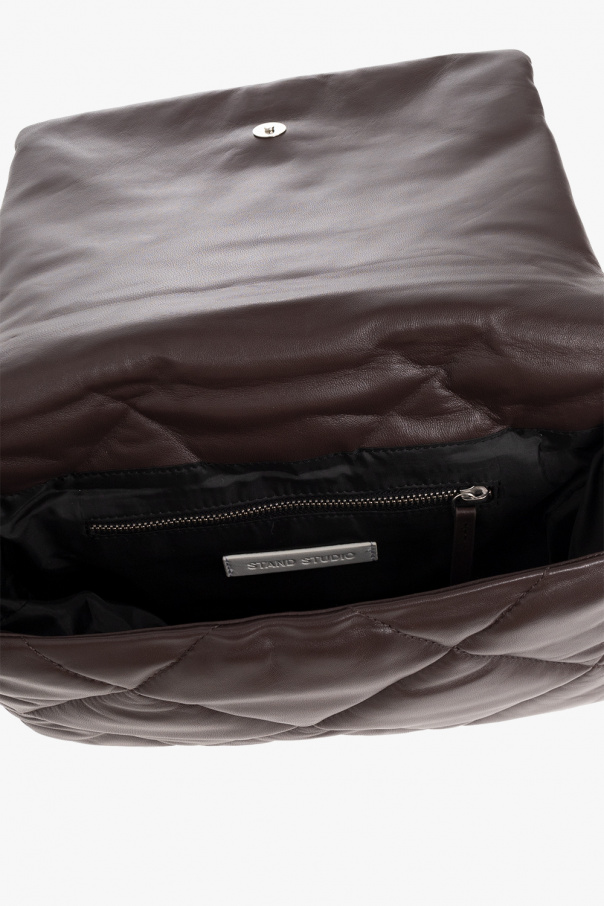Dark brown ‘Brynnie’ quilted shoulder bag from Stand Studio. Made of lamb leather, this model fastens with a magnetic snap and is complete with a detachable half-round chain handle, detachable, adjustable shoulder strap, silver-tone metal hardware and one internal compartment with one zip pocket.