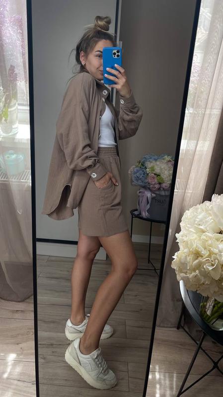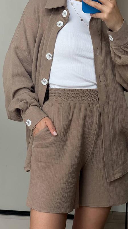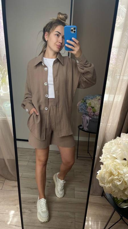 Рост 160 см.Базовый костюм: рубашка+шорты. Ткань легкая и приятная к телу. Рубашка в стиле oversize, застегивается на пуговицы, шорты на резинке, карманы функциональные.