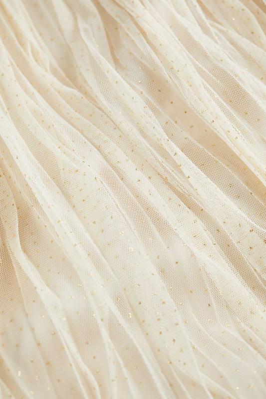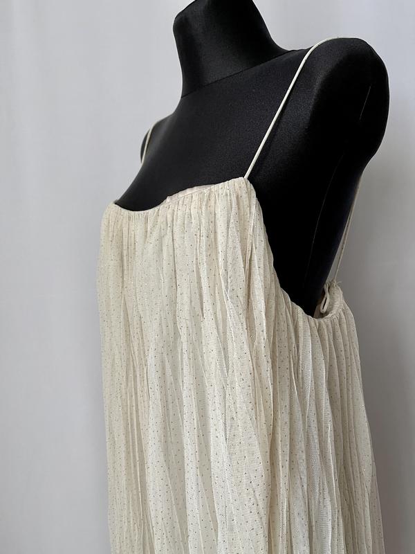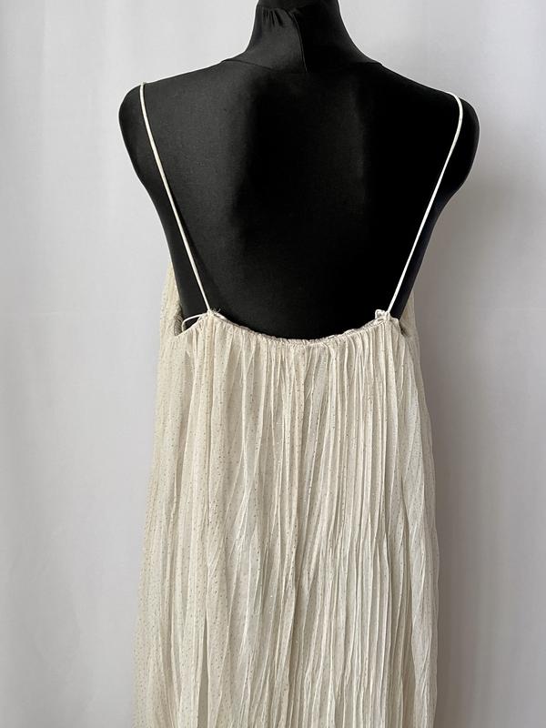 Платье свободное длиной до икры из плиссированной сетки с набивным металлизированным рисунком звездочки. Квадратный вырез, узкие регулируемые бретели и потайная резинка в верхней части спины. Атласная подкладка. Размер L