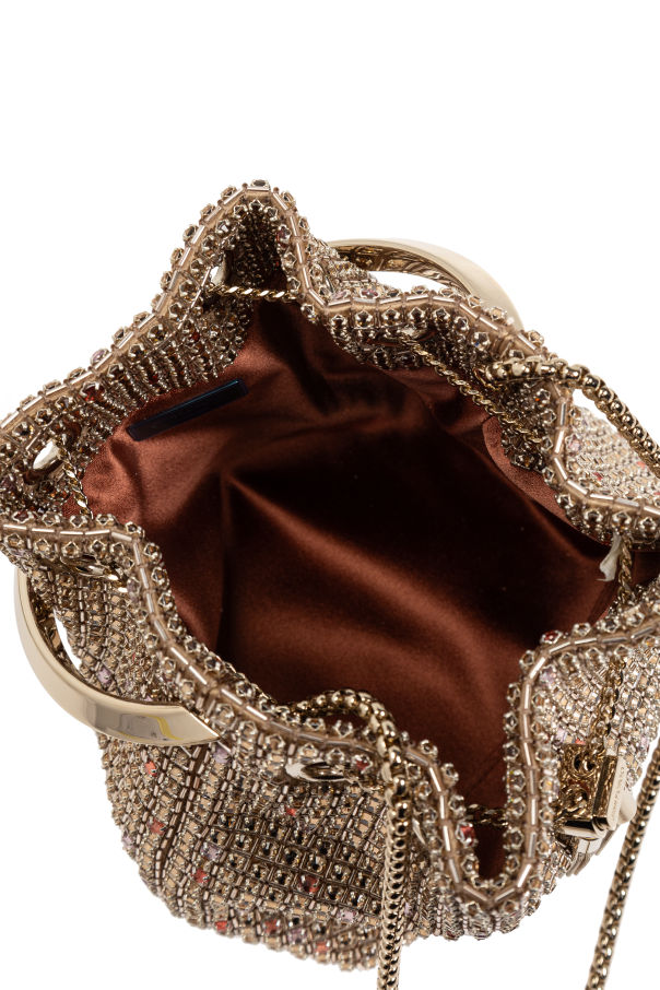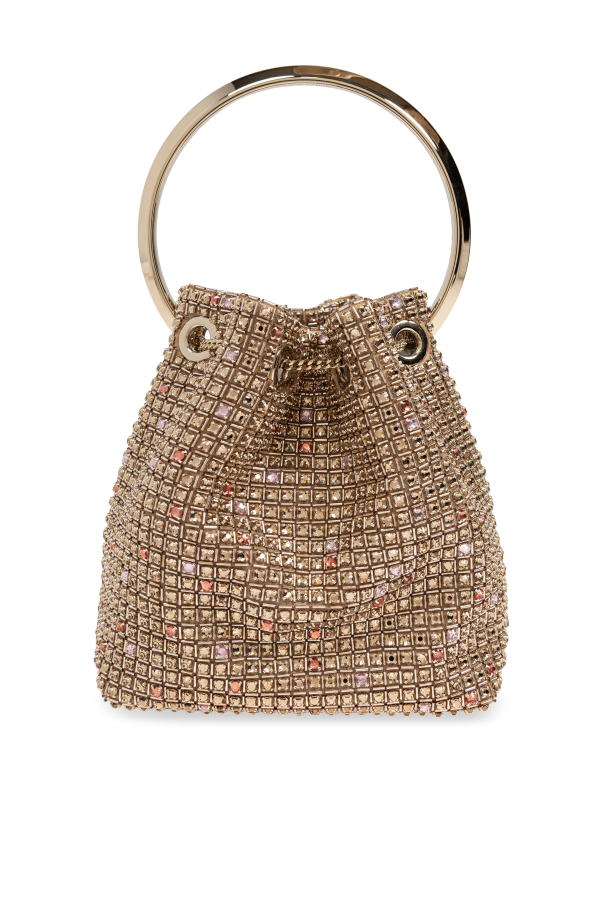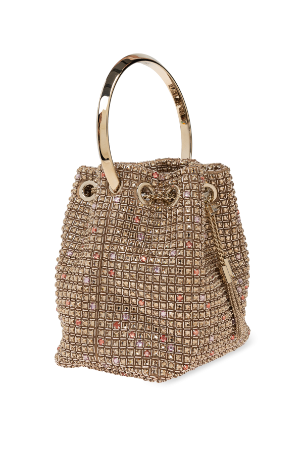 Presenting the exclusive ‘Bon Bon’ Bucket Shoulder Bag from the esteemed designer, Jimmy Choo. This extraordinary piece is a testament to unparalleled craftsmanship and sophisticated elegance. The bag showcases a classic bucket shape, accentuated by a wide top opening that can be cinched with a luxurious drawstring chain. Its solid, semicircular handle, encrusted with shimmering crystals, offers a touch of opulence, allowing it to be carried gracefully by hand. The exterior surface is adorned with meticulously arranged, lustrous squares that create a dazzling visual effect. Predominantly in shades of gold, these squares are interspersed with vibrant accents, imbuing the bag with a radiant allure. The interior is lined with a rich, dark brown fabric, providing a refined contrast to the sparkling exterior. Intricate details such as gold-toned metal hardware, eyelets for the drawstring chain, and a small engraved metal plaque bearing the designer’s name enhance the bag\'s modern sophistication. The spacious interior is perfect for carrying everyday essentials with ease. Why Choose This Product? Elegant bucket design with a luxurious drawstring chain closure. Opulent exterior with gold-toned shimmering squares. Intricate details including a semi-circular crystal-encrusted handle. Spacious interior, ideal for daily essentials. A timeless piece from the iconic Jimmy Choo brand, known for its grandeur and exquisite craftsmanship.
