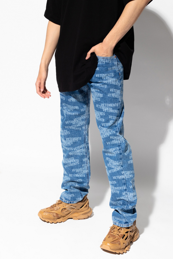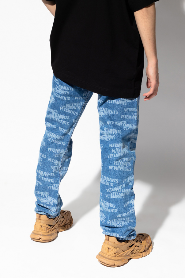 Blue jeans with a logo from VETEMENTS. Fastened with buttons, this pair is falls down with straight legs and is complete with three front pockets and two back pockets.
