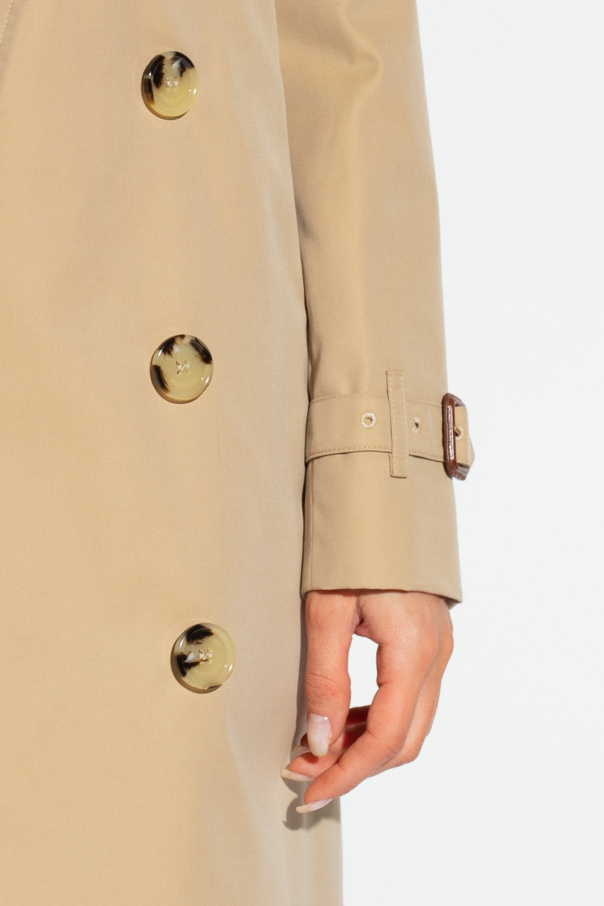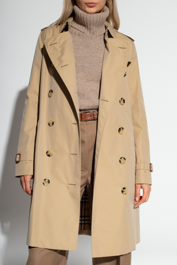 Beige ‘Kensington’ trench coat from Burberry. Crafted from cotton with a mid-length, this style features a double-breasted silhouette, button fastenings, a collar with a hook & eye closure, shoulder epaulettes, a storm flap, two buttoned pockets, a back button-through vent, and long sleeves with adjustable buckle cuff straps.