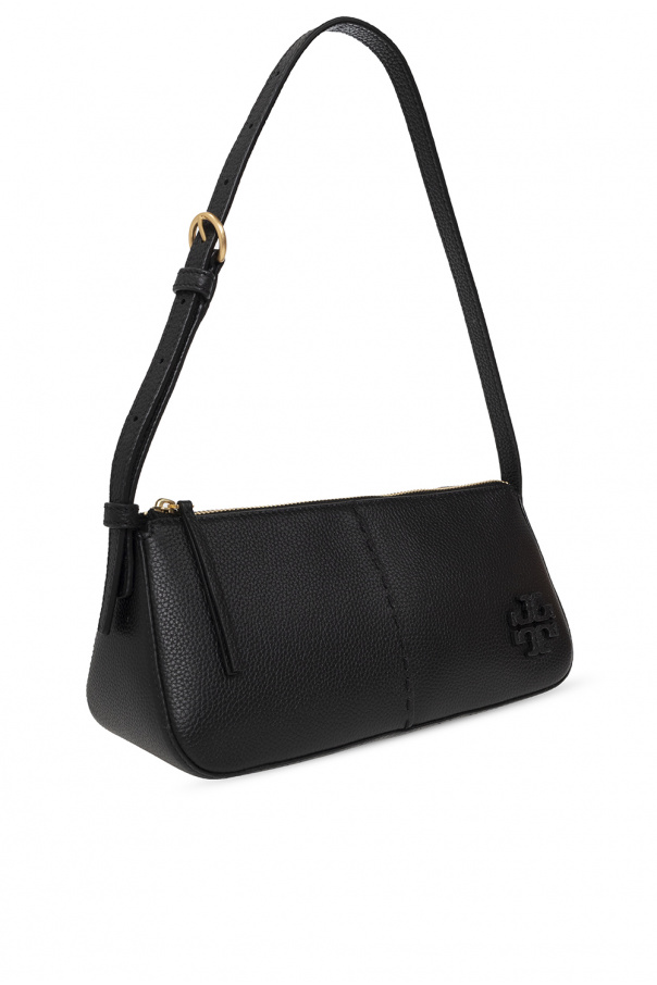 Black ‘McGraw’ shoulder bag from Tory Burch. Crafted from leather, this design fastens via a zip and features a logo application on the front, an adjustable shoulder strap, gold-tone metal hardware and one internal compartment with a slip pocket.