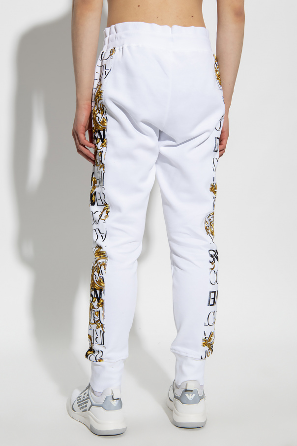 White sweatpants from Versace Jeans Couture. Made of cotton, this pair features an elastic waistband with drawstrings, yellow, black and brown pattern, black logo, two slip pockets and elasticated cuffs.