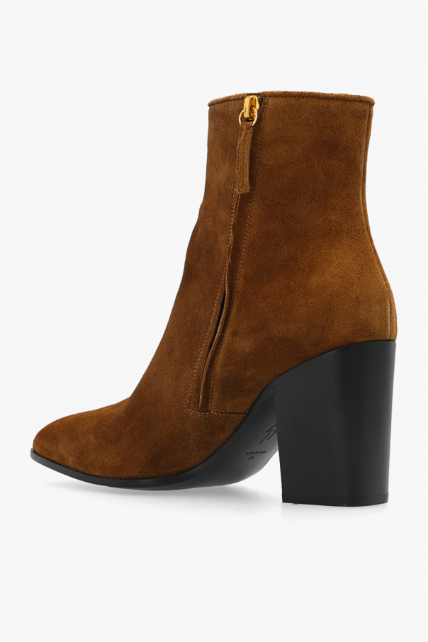 Brown ankle boots from Giuseppe Zanotti. Crafted from suede, this model sits on a black leather sole and showcases gold-tone logo hardware and a zip fastening.