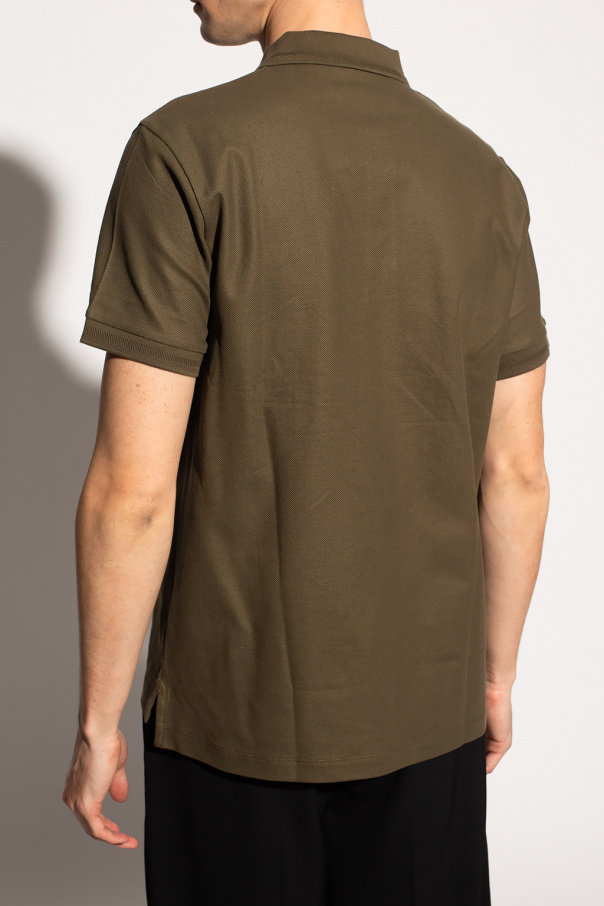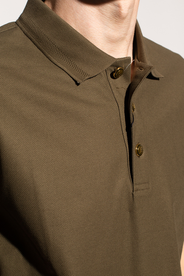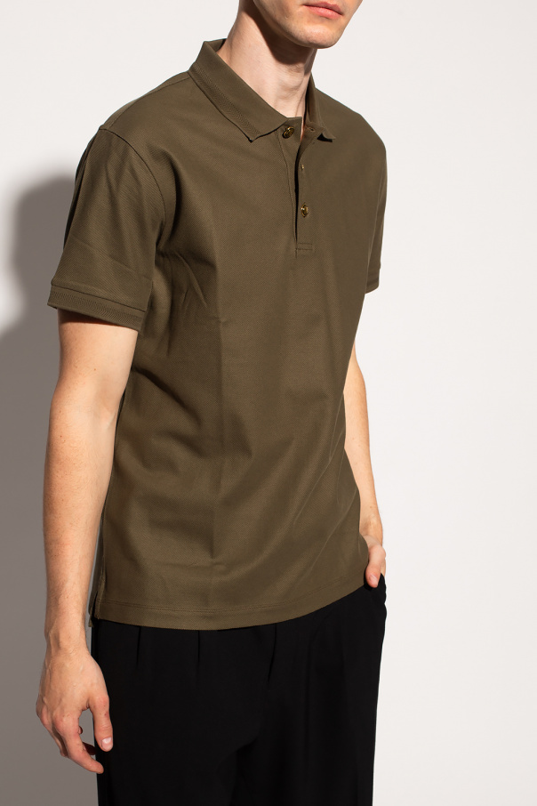 Green polo shirt from Burberry. Crafted from cotton, this style features short sleeves and gold-tone logo-embossed buttons.