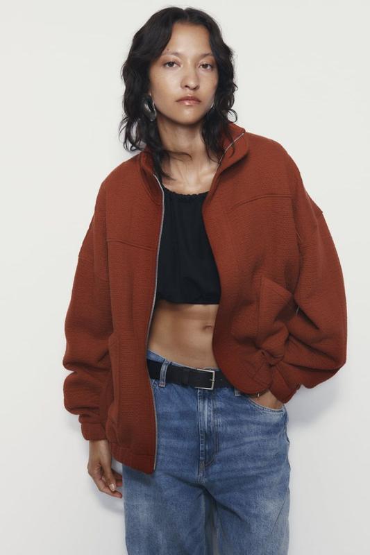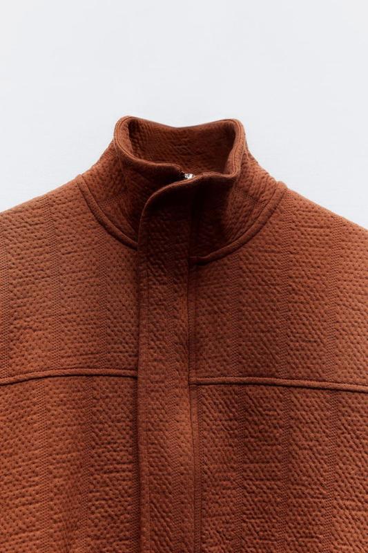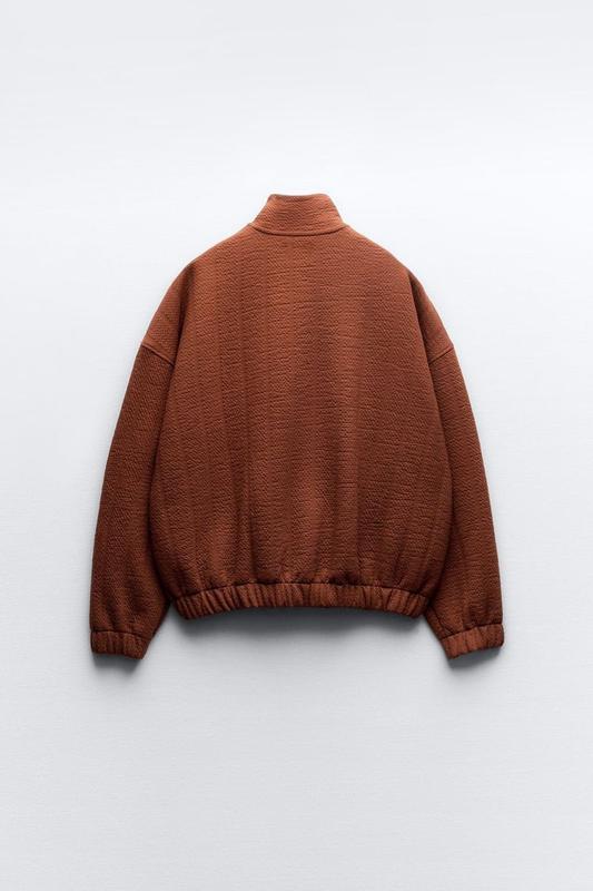 Бомбер вільного крою з високим коміром і довгими рукавами з еластичними манжетами.