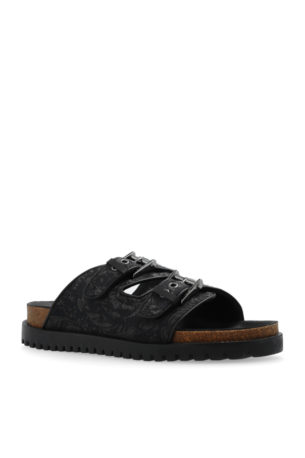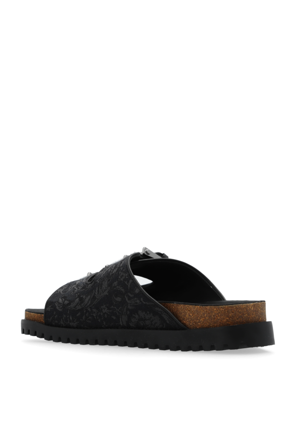 Black and grey mules from Versace. Embellished with a Barocco pattern, this model features a brown and black sole in cork and rubber and adjustable straps with silver-tone buckles.