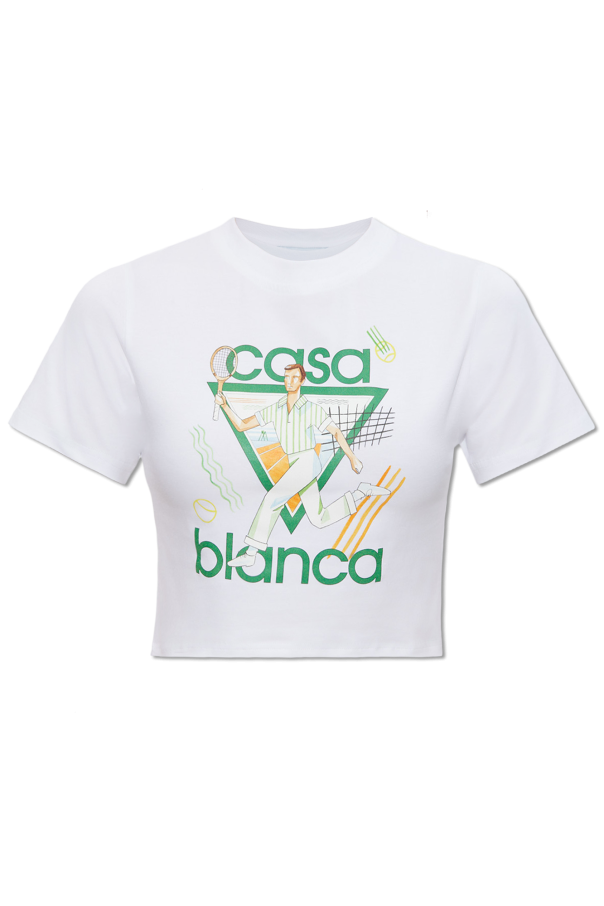 White crewneck T-shirt from Casablanca. Made of cotton with a cropped fit, this style showcases a colourful graphic print with a motif of a tennis player and logo, short sleeves and ribbing on the collar.
