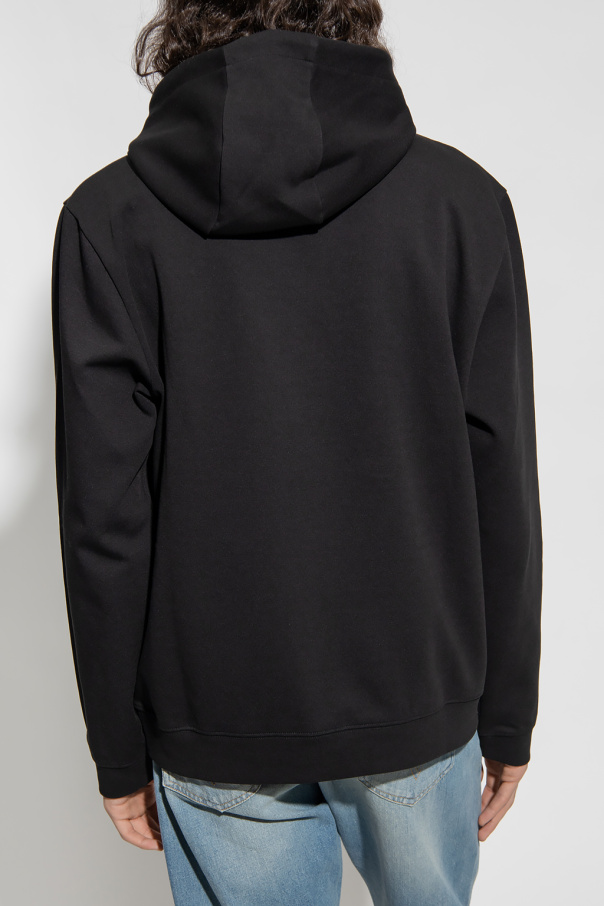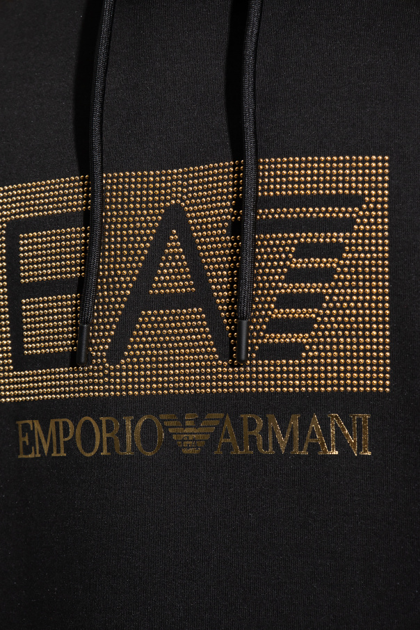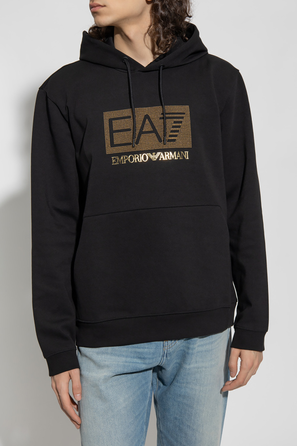 Black hoodie from EA7 Emporio Armani. Made of cotton, this long sleeve design features a drawstring hood, gold-tone logo print embellished with crystals, slip pocket and ribbed trims at the hem and cuffs.