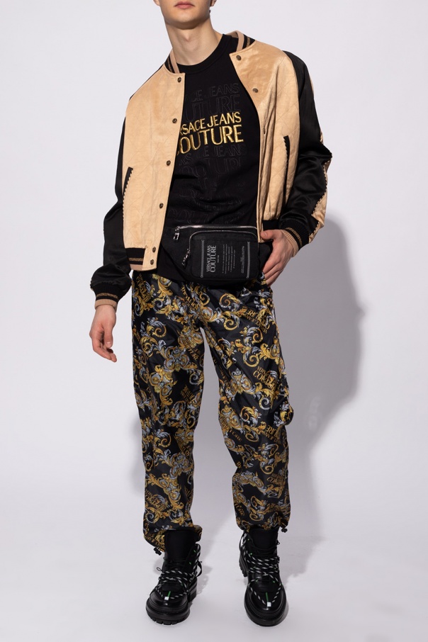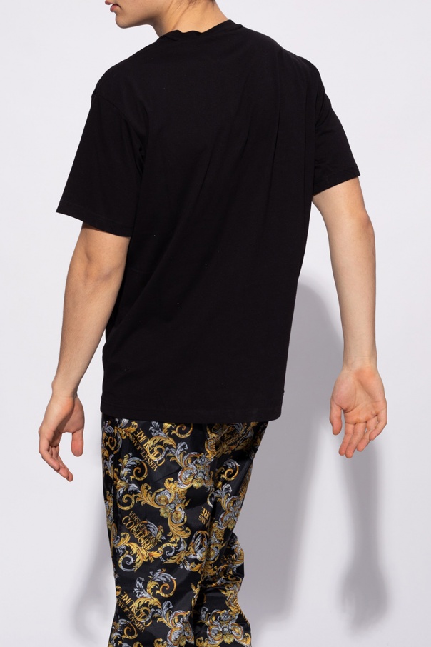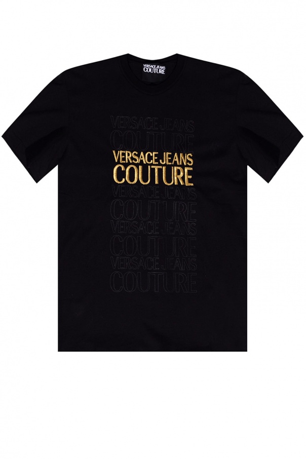 Black T-shirt from Versace Jeans Couture. Crafted from cotton, this short sleeve design features a printed and embroidered logo pattern in gold-tone and black as well as a ribbed round neck.