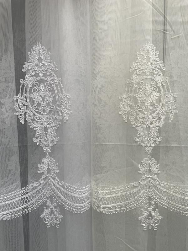 робить такі вироби практичними та зносостійкими.Тюль прикрашений вишивкою, яка додає виробу вишуканості та елегантності.