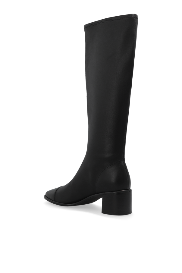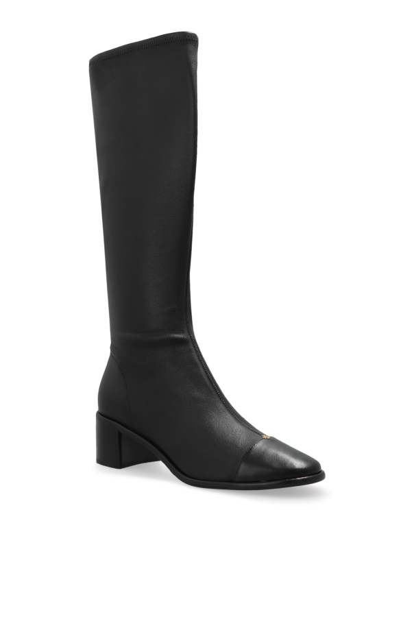 Introducing the epitome of sophistication and timeless elegance: the Black Leather Boots from the exclusive women\'s collection by Tory Burch. These knee-high boots, crafted with impeccable precision, are the ultimate addition to any refined wardrobe. The boots feature a sleek, minimalist design with a rounded toe and a mid-heel that is both wide and stable, ensuring comfort without compromising on style. The smooth, glossy leather exterior exudes an air of luxury, while the discreet yet sturdy stitching speaks volumes about the quality of craftsmanship. Adding a touch of subtle sophistication, a small, golden logo graces the front near the toe, serving as a hallmark of the designer\'s distinctive style. The absence of visible zippers suggests an easy slip-on design, enhancing both convenience and aesthetic appeal. Rendered in classic black, these boots are versatile and seamlessly complement a myriad of outfits. As demonstrated in the accompanying images, they pair beautifully with a black pleated midi skirt and a classic blouse, making them suitable for both everyday wear and more formal occasions. Crafted from premium leather, both inside and out, these boots promise unmatched durability and comfort. The leather sole further augments their luxurious feel, ensuring that each step you take is one of elegance. Why Choose This Product? Timeless and elegant knee-high design Mid-heel for added stability and comfort High-quality, glossy leather for a luxurious finish Subtle golden logo for a touch of sophistication Versatile black color that suits various styles Exquisite craftsmanship with discreet, solid stitching